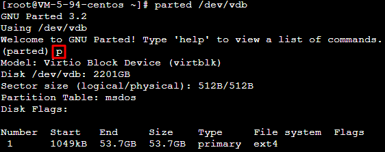 /dev/vdb as an example, run the following command:parted /dev/vdb