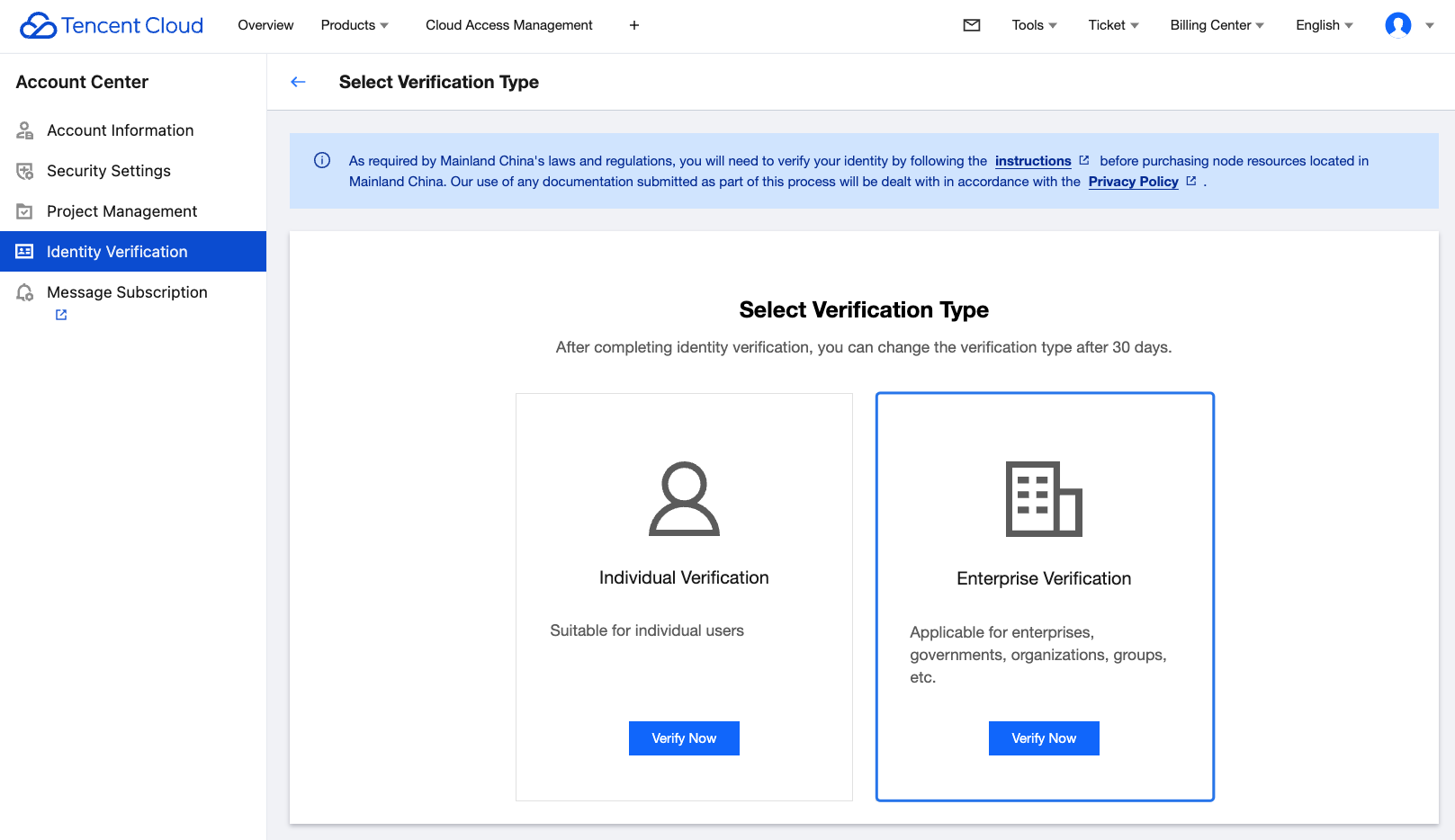 1. Log in to the Tencent Cloud Console and go to Account Information, navigate to Basic Information > Verification Status, and click Submit for Verification. 2. Select Enterprise Verification.