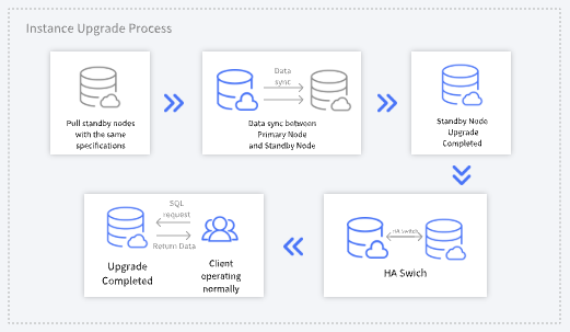 For the primary instance currently in the upgrade process, the system will pull a new secondary node with the same specification type as the original instance, sync data from the primary node to the new secondary node, and complete the upgrade on this secondary node. After the upgrade is completed, a primary/replica switch will be performed within the switch time specified by the user.