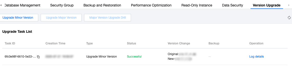 After the upgrade task ends, the upgrade task record will be displayed in version upgrading on the instance details page.