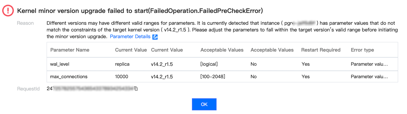 During the upgrade, some parameters may be adjusted. Certain changes require restarting the database for the changes to take effect. Ensure your business has a reconnection mechanism.