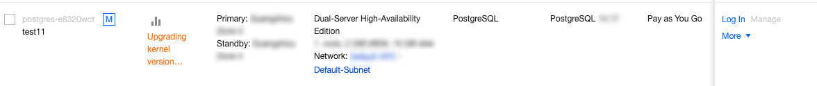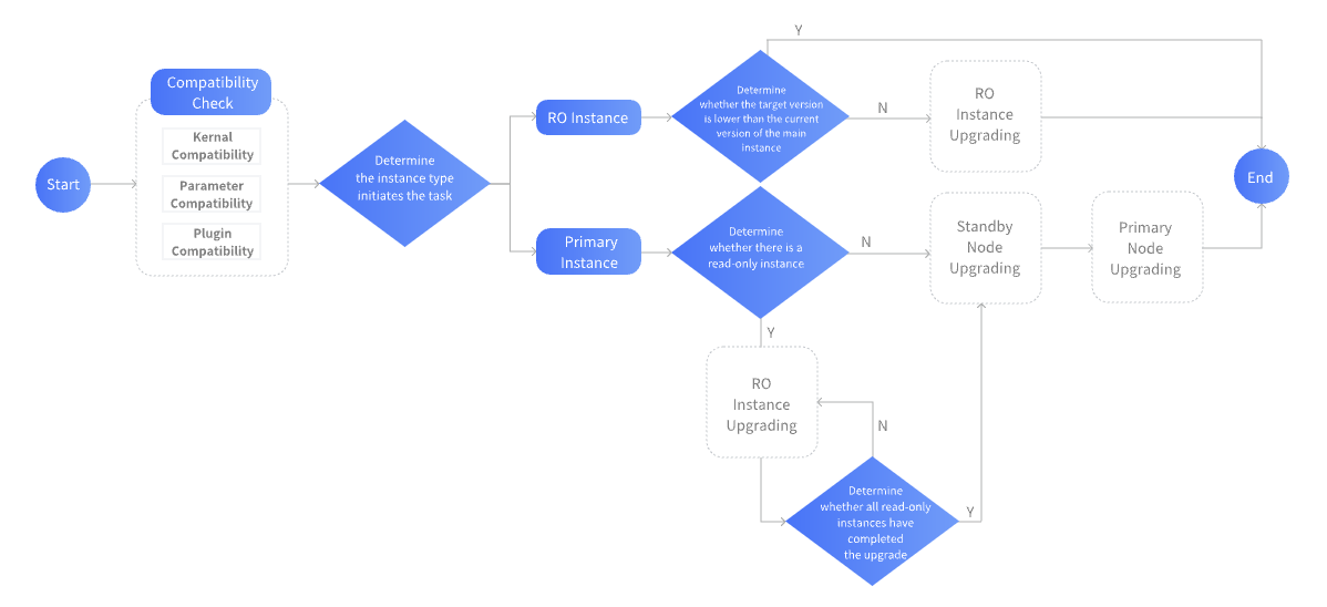 When initiating a kernel minor version upgrade task for the primary instance, all associated isolated, decommissioned but unrecovered read-only instances will also be upgraded. Both the primary and standby instances will enter the "upgrading kernel version" status. Instances in this status can still log in to use normally but are unable to perform management operations. Once an instance upgrade is complete, its status will restore to "running".