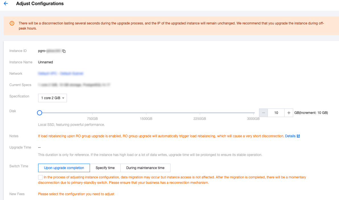 1. Log in to the TencentDB for PostgreSQL console, go to the master instance details page, click Read-Only Instance, and select the Adjust Configuration button for the read-only instance. 2. Adjust specifications as needed, then click Submit.