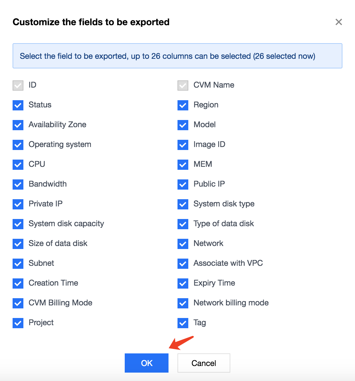 You can export the list of instances on a specified host in the console and customize the fields contained in the export list. You can check up to 26 fields, including: ID, host name, status, region, availability zone, host type, operating system, image ID, CPU, memory, bandwidth, public IP, private IP, system disk type, system disk size, data disk type, data disk size, network, subnet, associated VPC, creation time, expiration time, host billing method, network billing mode, project and tag.