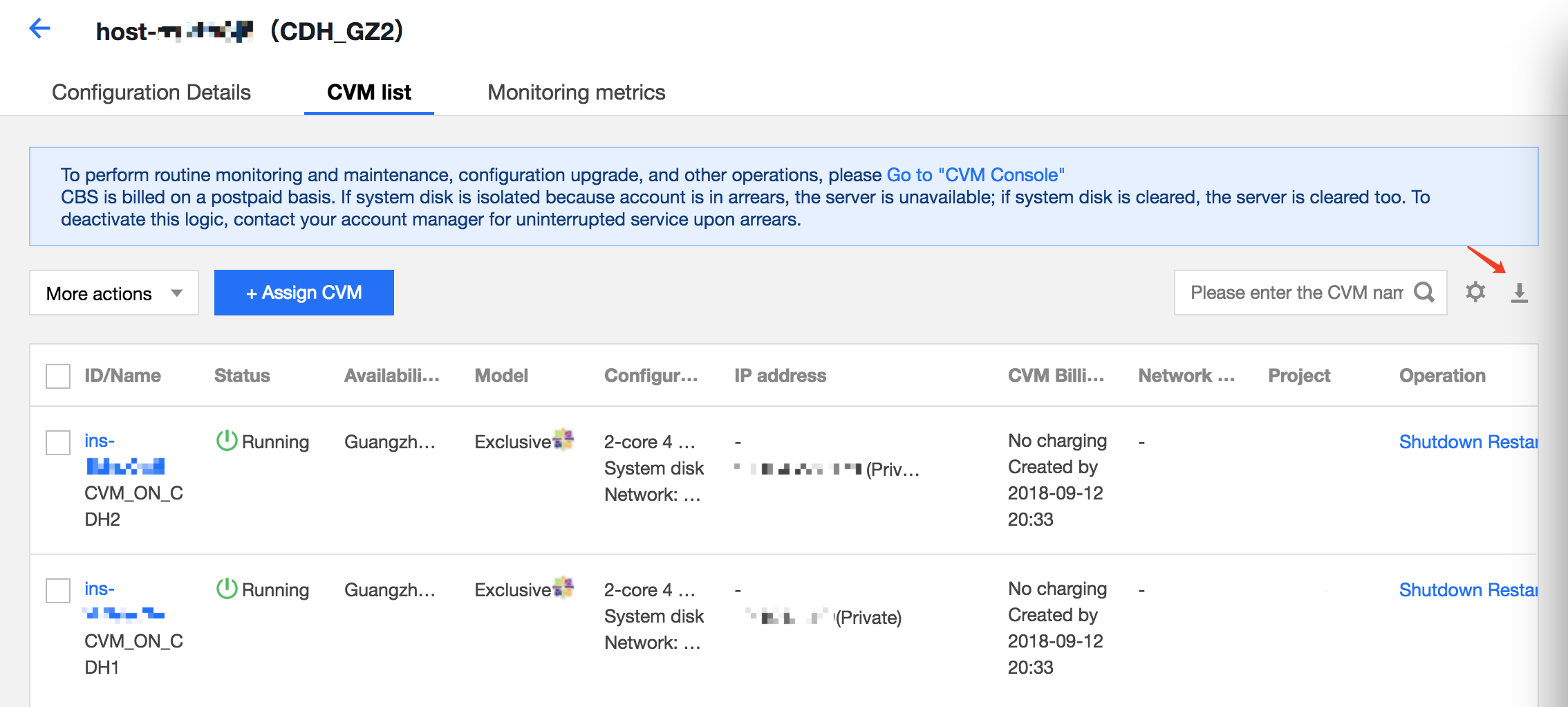2. Select a region. Click the ID/Host Name of the target dedicated host to enter its details page, select the CVM list tab, and click Download as shown below.