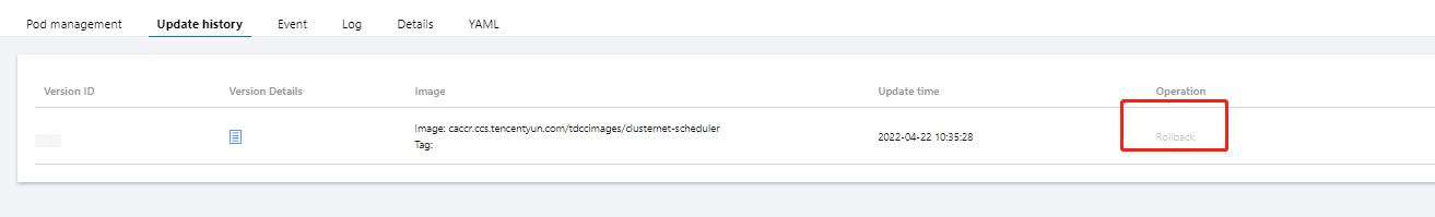 1. Log in to the TKE console and select Cluster in the left sidebar. 2. Click the ID of the cluster for which to roll back the Deployment to go to the management page of the cluster.