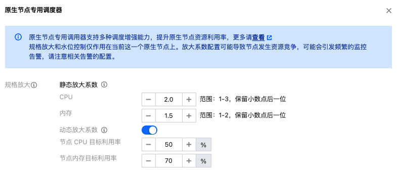 规格放大 | 虚拟放大原生节点规格,调度更多的 Pod,让当前节点装箱率突破100%。 注意: |