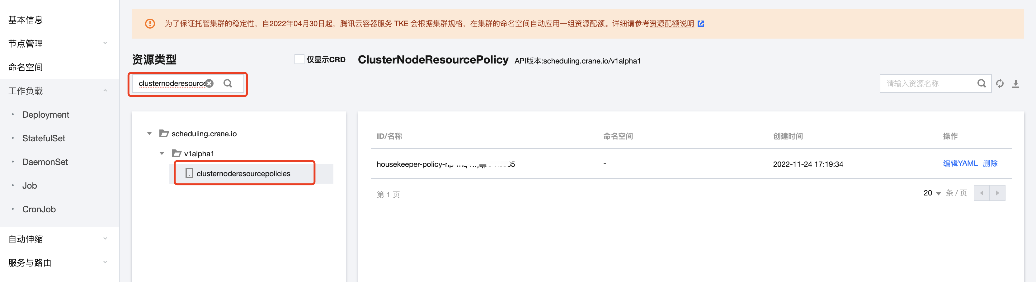 apiVersion: scheduling.crane.io/v1alpha1kind: ClusterNodeResourcePolicymetadata:name: housekeeper-policy-np-88888888-55555 # name 不能重名spec:applyMode: annotation # 默认值,暂不支持其它数值nodeSelector: # 用来选取一组相同配置的节点,比如下面是用来选取一个原生节点,它的 ID 是 np-88888888-55555。也可以使用一批节点共有的标签,实现批量节点的选择。matchLabels:cloud.tencent.com/node-instance-id: np-88888888-55555template:spec:resourceExpansionStrategyType: auto # 开启节点动态放大autoResourceExpansion:crontab: 0 * * * 0-6decayLife: 168h# 设置节点动态放大的具体参数maxRatios:cpu: "2"memory: "1.5"minRatios:cpu: "1.0"memory: "1.0"targetLoadThreshold:percents:cpu: 50memory: 70# evictLoadThreshold 是原生节点运行时水位控制,设定当前这批原生节点驱逐资源利用率,保障稳定性。Pod 在原生节点上运行时,高于该水位的原生节点可能发生驱逐。为避免驱逐关键的 Pod,该功能默认不驱逐 Pod。对于可以驱逐的 Pod,用户需要显示给判断 Pod 所属 workload。例如,statefulset、deployment 等对象设置可驱逐 annotation:descheduler.alpha.kubernetes.io/evictable: 'true'。# evictLoadThreshold 要大于 targetLoadThreshold,否则驱逐后,节点可能持续被调度新的 Pod 导致抖动evictLoadThreshold:percents:cpu: 80memory: 80# targetLoadThreshold 是原生节点调度时水位控制,设定当前这批原生节点目标资源利用率,保障稳定性。Pod 调度时,高于该水位的原生节点将不被选中。# targetLoadThreshold 要小于 evictLoadThreshold,否则驱逐后,节点可能持续被调度新的 Pod 导致抖动targetLoadThreshold:percents:cpu: 70memory: 70