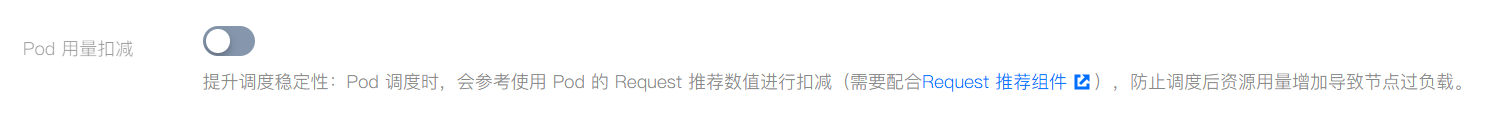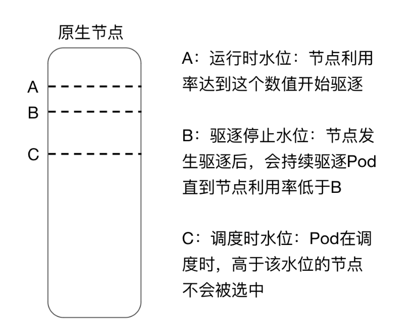 运行时水位控制 | 设定当前原生节点目标资源利用率,保障稳定性。节点运行时,高于该水位的节点可能引发驱逐,前提需要在指定工作负载上标识可驱逐的标签。 注意: 1. 默认不驱逐业务 Pod。为避免驱逐关键的 Pod,该功能默认不驱逐 Pod。对于可以驱逐的 Pod,用户需要在这些 Pod 所属 workload 上做表示,组件才会在触发水位线时做驱逐操作。例如,statefulset、deployment 等对象设置可驱逐 annotation: descheduler.alpha.kubernetes.io/evictable: 'true'2. 需要有足够多的低负载节点才会驱逐。为保证 Pod 在驱逐后有节点可以容纳,调度器在驱逐时要求至少有三个原生节点的利用率低于这几个节点上的调度时水位线。因此,如果集群中存在很多原生节点,但是开启水位线的原生节点数量小于三个,或者低于调度时水位线的原生节点少于三个,则驱逐无法执行。 |