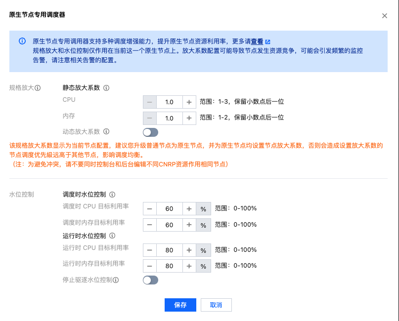 调度时水位控制 | 设定当前原生节点目标资源利用率,保障稳定性。Pod 调度时,高于该水位的节点将不被选中。 调度时水位同时默认作为: 1. 驱逐停止水位线:节点利用率在达到运行时水位,发生驱逐后,驱逐到的目标水位线。