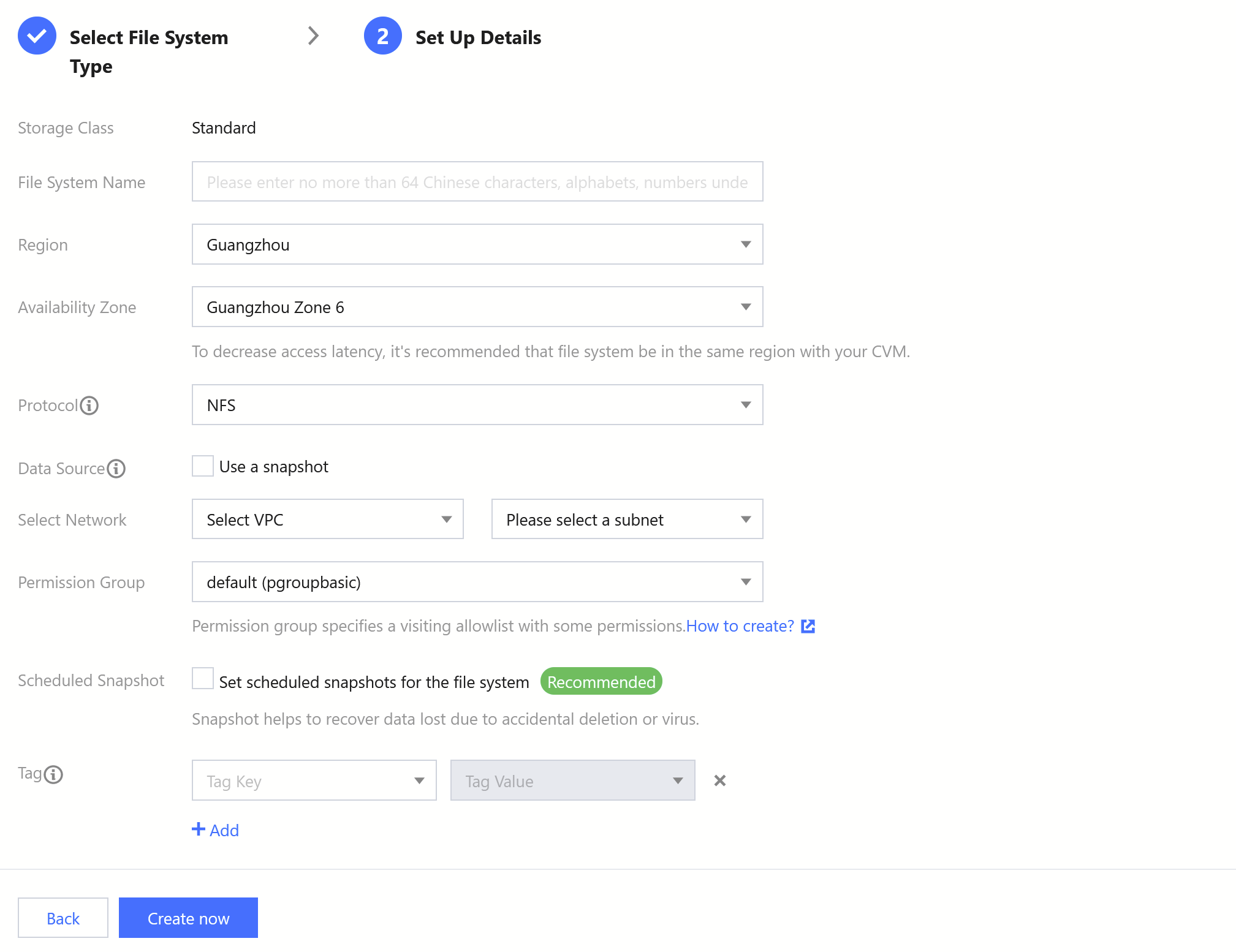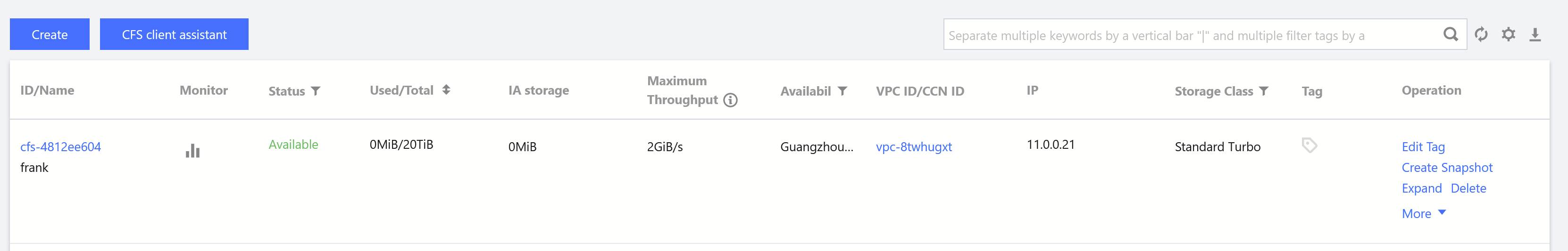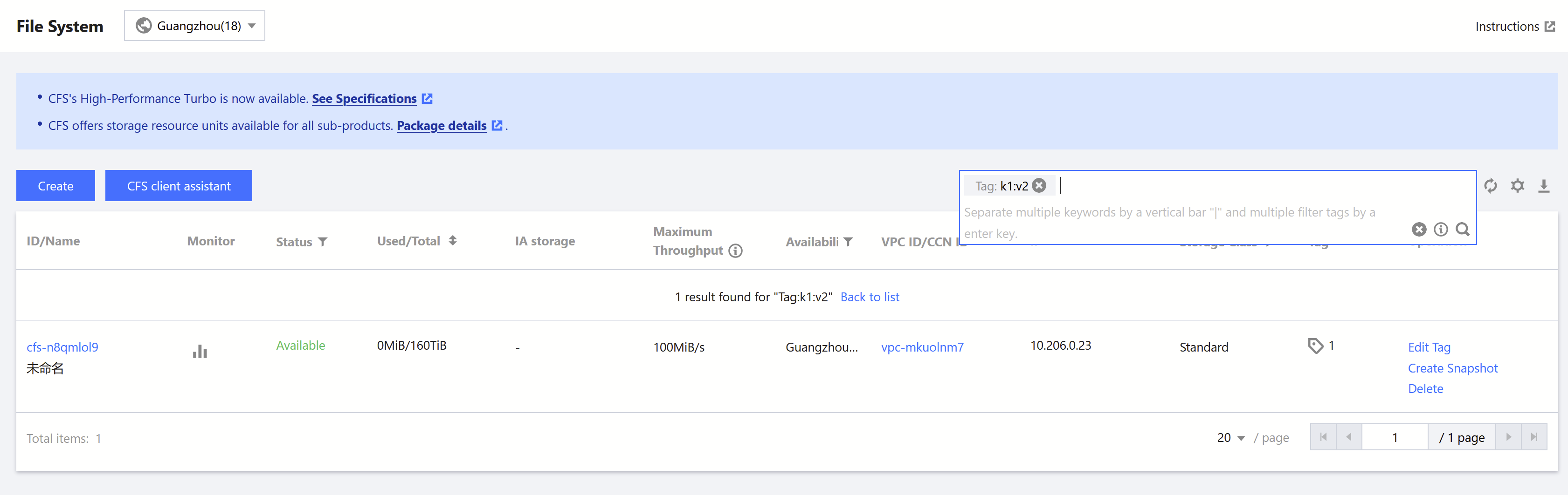 Make sure you have a tag that you can use before creating a file system. If you do not have any tags, go to the Tag console and create one. 2. On the file system list page, click Create.