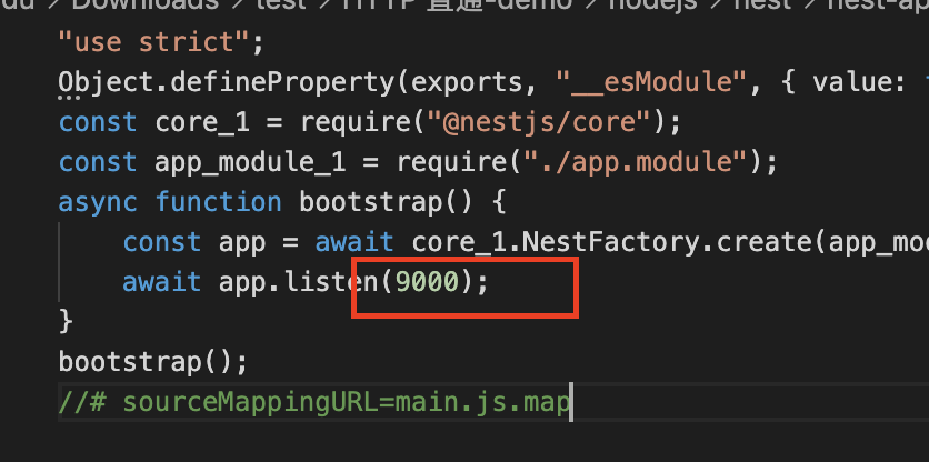 1. Modify the bootstrap file ./dist/main.js to change the listening port to 9000 as shown below: