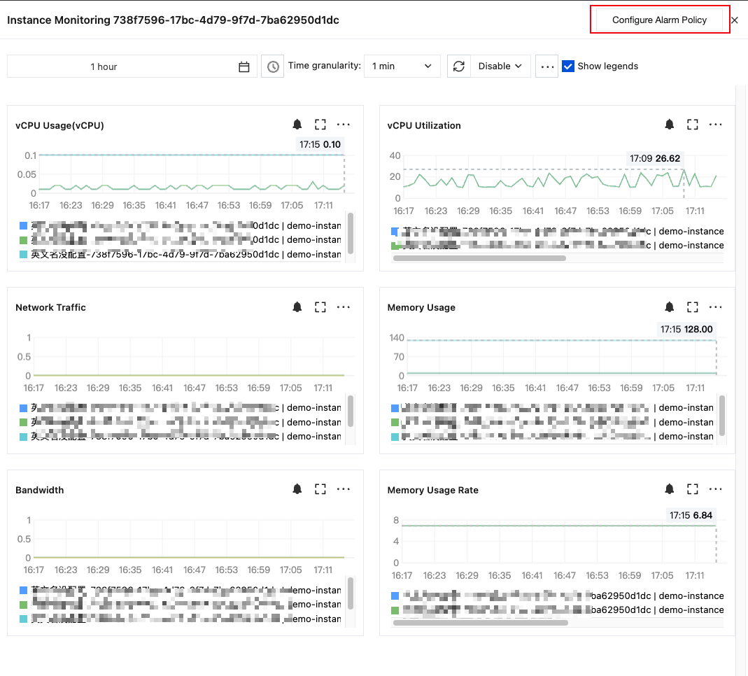 Monitor CPU, memory, and network metrics of a single instance in real-time to accurately diagnose resource usage and identify matching issues between specification and workload.