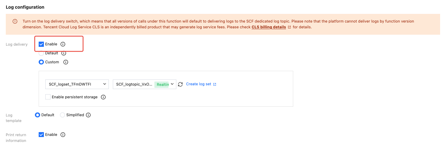 2. On the list page of "Function Service", enable log delivery when creating/updating a function.