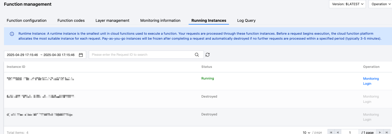 Running Instance: A running instance is the minimum unit used by SCF to run functions. Your requests are processed through function instances. Before a request starts execution, SCF assigns the most appropriate instance for each request. Pay-as-you-go instances are frozen after processing requests. If they do not process requests for a period of time (usually 3 to 5 minutes), they are automatically destroyed. The running instance command line operation feature supports executing specified commands in the actual runtime environment of the instance, such as logging in to the instance to view instance environment information.