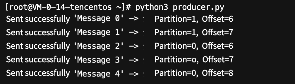 from kafka import KafkaProducer# Create a producer.producer = KafkaProducer(bootstrap_servers='$domainName:$port', # Replace with your Kafka address.api_version=(2, 8, 0), # Explicitly specify the protocol version (to be adjusted based on the cluster instance).retries=2147483647, # Set the number of retries to the maximum value for integer data type (infinite retries).retry_backoff_ms=1000, # Retry interval of 1 second.acks=1 # Wait for the acknowledgment only from the leader, but not all replicas.)# Send messages.for i in range(5):msg = f"Message {i}"future = producer.send('$topic_name', value=msg.encode('utf-8')) # $topic_name needs to be created in the console in advance, and be sure to replace it.result = future.get(timeout=10)print(f"Sent successfully: '{msg}' -> Partition={result.partition}, Offset={result.offset}")producer.close()