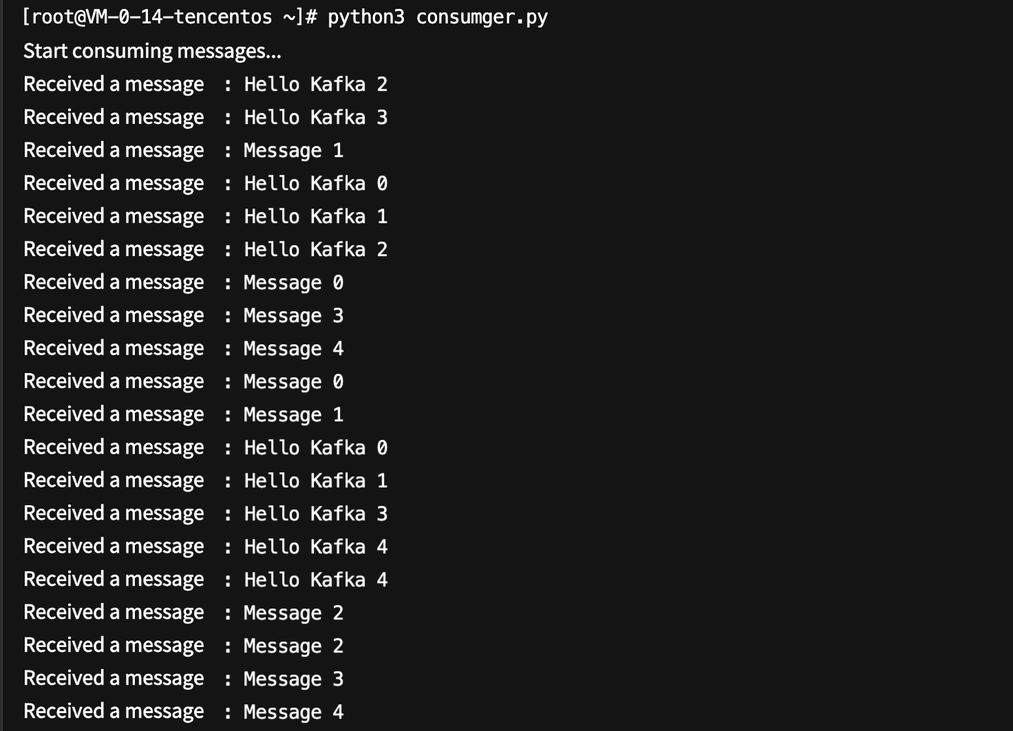 from kafka import KafkaConsumer# Create a consumer.consumer = KafkaConsumer('$topic_name', # Topic name.bootstrap_servers='$domainName:$port', # Replace with your Kafka address.group_id='$group_id', # Specify the consumer group name.auto_offset_reset='earliest', # Start reading from the earliest message.api_version=(2, 8, 0), # Explicitly specify the protocol version.enable_auto_commit=True)print("Start consuming messages...")try:for msg in consumer:value = msg.value.decode('utf-8')print(f"Received the message: {value}")except KeyboardInterrupt:print("Consumers have stopped.")finally:consumer.close()