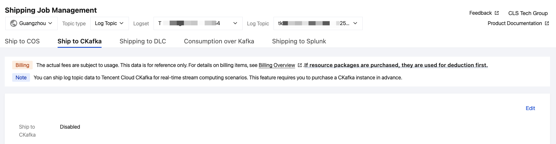In the left sidebar, click Log Topic and select the log topic to be shipped to CKafka to go to the log topic management page. Click the Ship to CKafka tab.