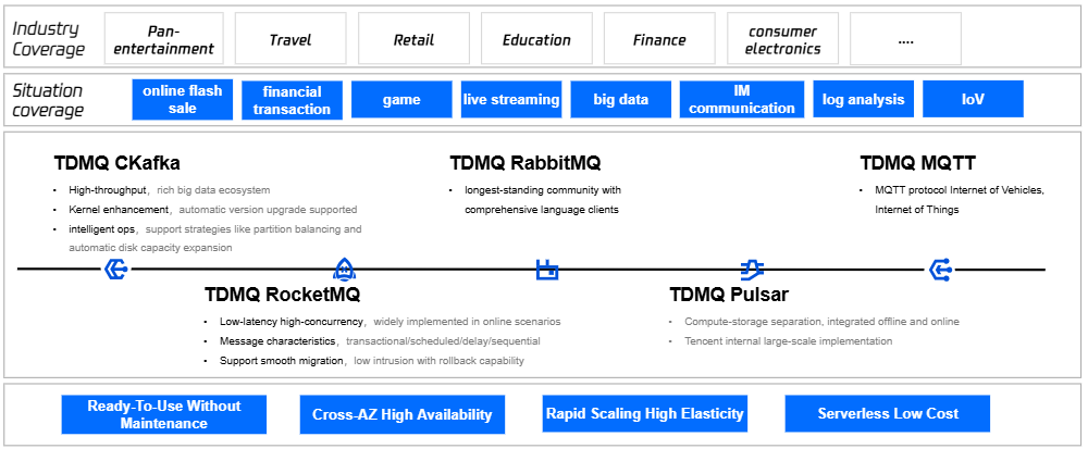 TDMQ can provide the appropriate product form and solution for different customer scenarios and needs. If you have any requirement, contact us for consultation. |