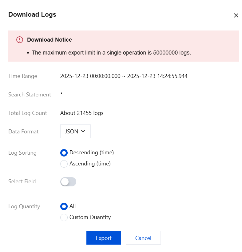 A maximum of 1 million logs can be downloaded in a single task. If you need to download more than 1 million logs, it is recommended to split the download into multiple tasks.