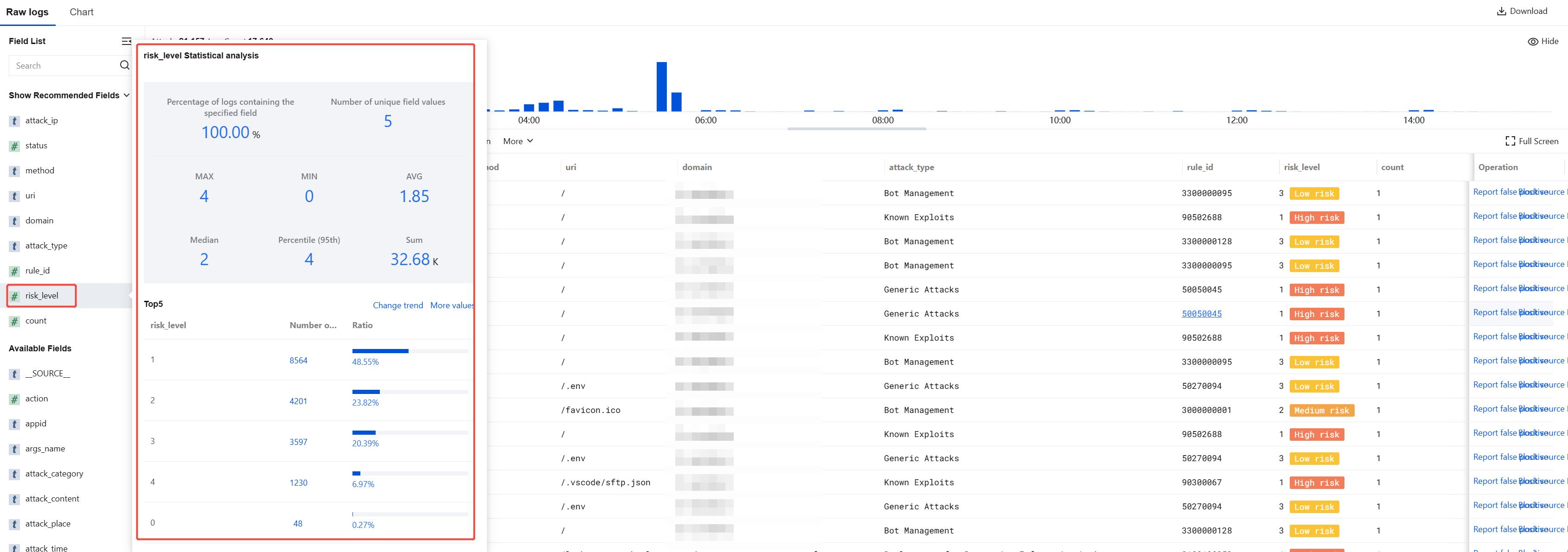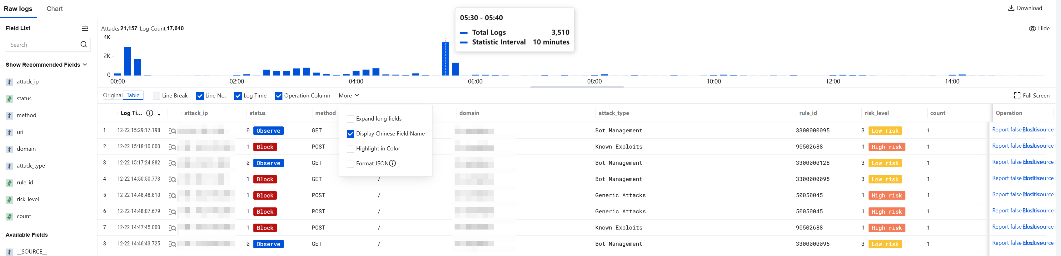 On the left of the raw log data list, click "field name" to display the TOP 5 matching field details sorted by the number of logs, along with their percentage of logs. For descriptions of the fields in the log details, see Field Descriptions for Log Details. In the Attack Logs data list, click to the left of the occurrence time of each displayed log to view field details; click JSON to view field details in JSON format. For descriptions of the fields in the log details, see Field Descriptions for Log Details. Chart