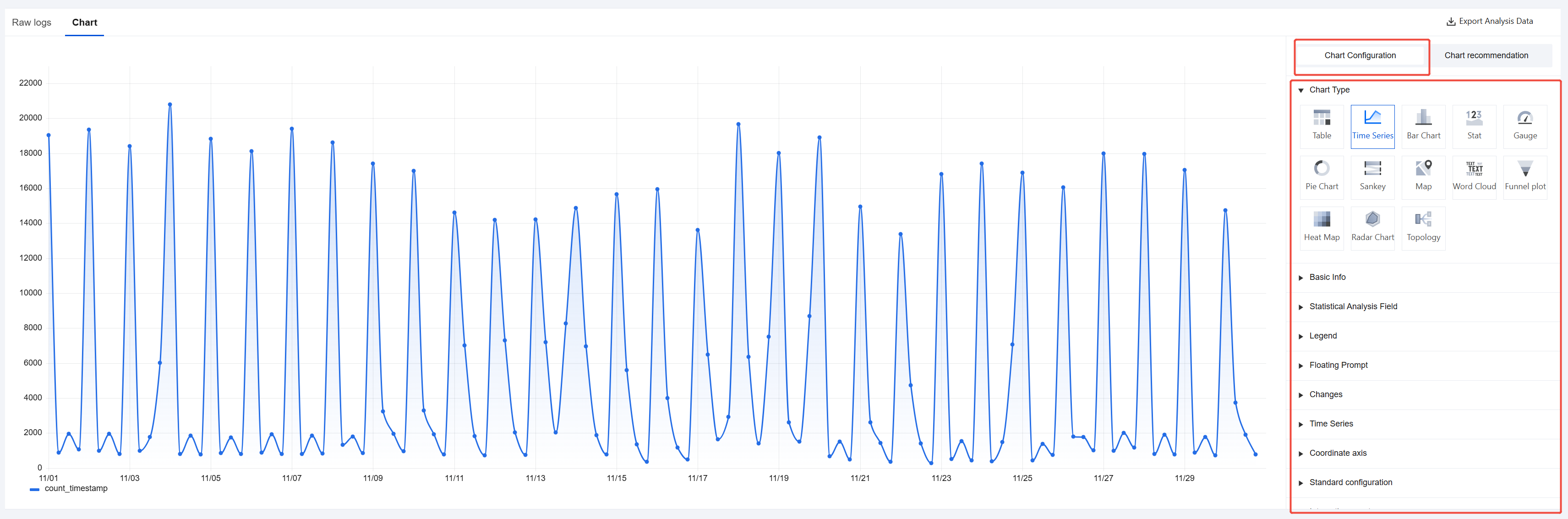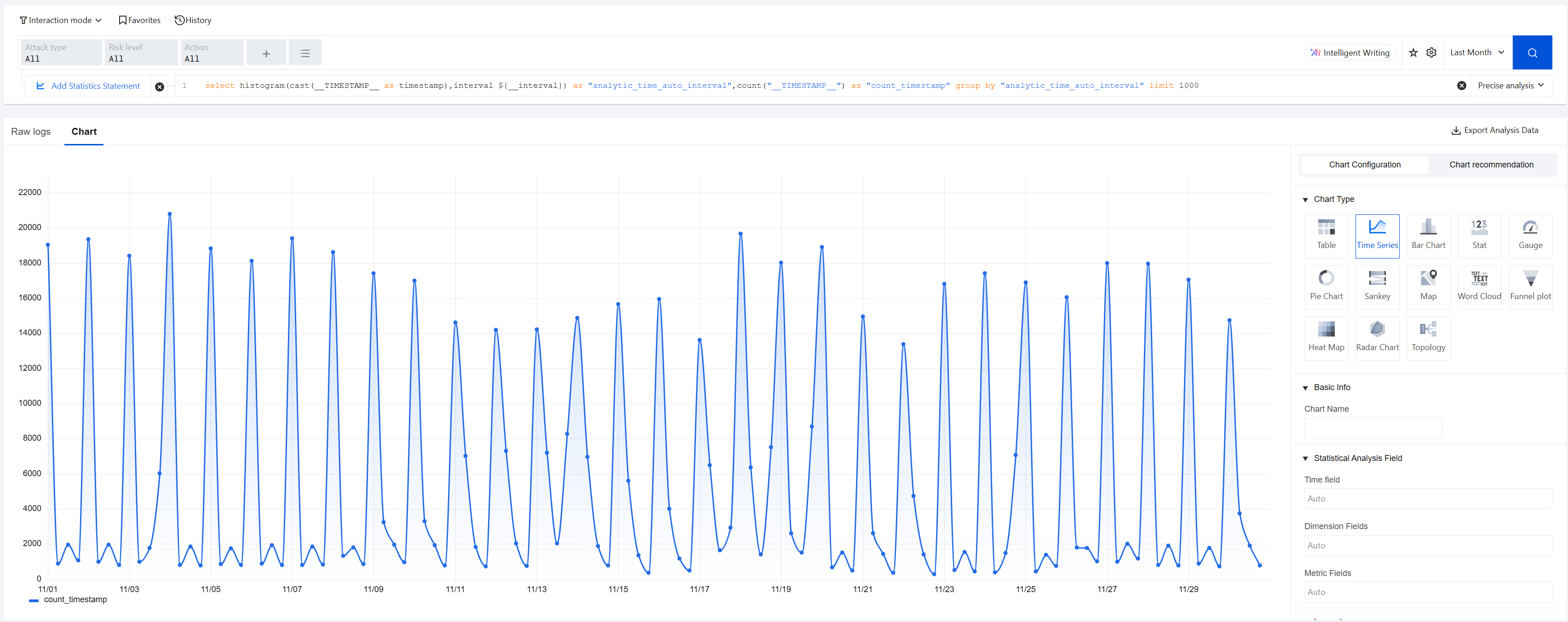 Above the Raw logs, you can view key information such as the total number of logs matching the current search conditions and their time distribution. You can also change the display style of Raw logs using the settings panel below.