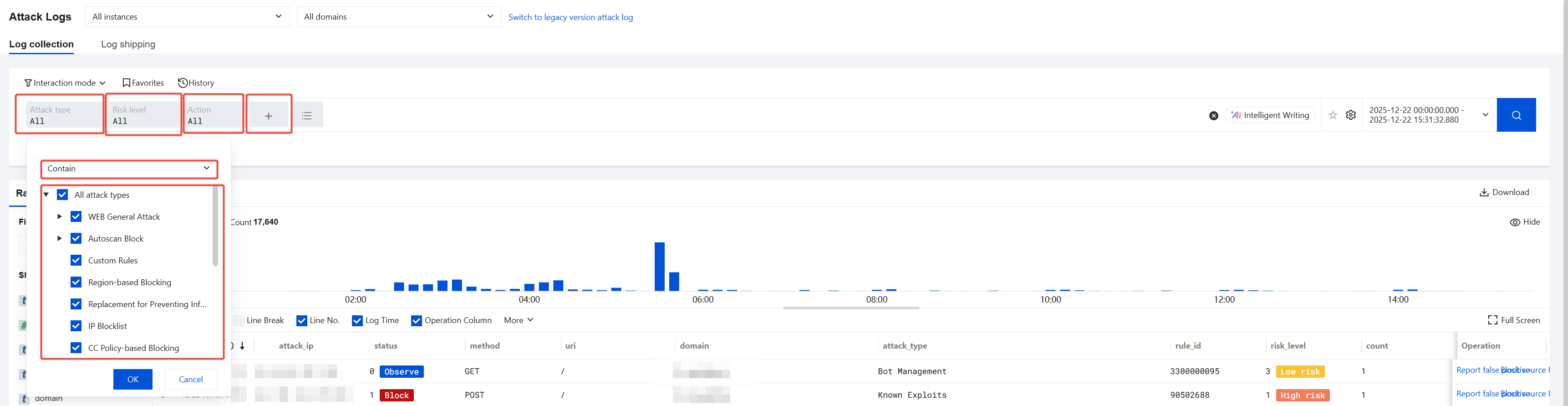 WAF provides the attack logging feature by default, which records details such as the attack time, source IP address, attack type, and attack specifics. Attack logs support search methods including full-text search, fuzzy search, and combined condition search. Additionally, it supports downloading logs based on search criteria and enables downloading millions of log entries.