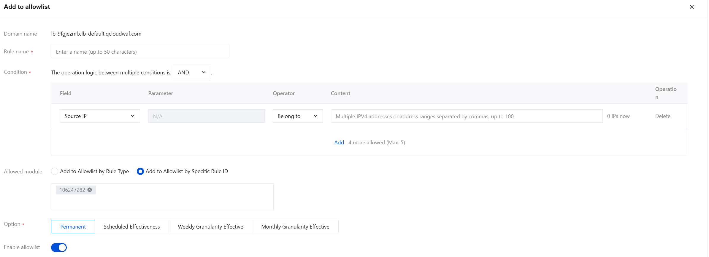 Report false positive: Supports one-click addition of precise allowlist rules for the corresponding protection module, no longer blocking access from the corresponding IP address. After the modifications are completed, click OK.