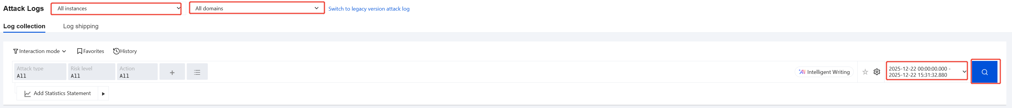 3. Before Attack Logs are searched, please first set the search scope. Select the instance and domain, set the time range, and click . Interactive mode: Attack logs are searched based on the search criteria.