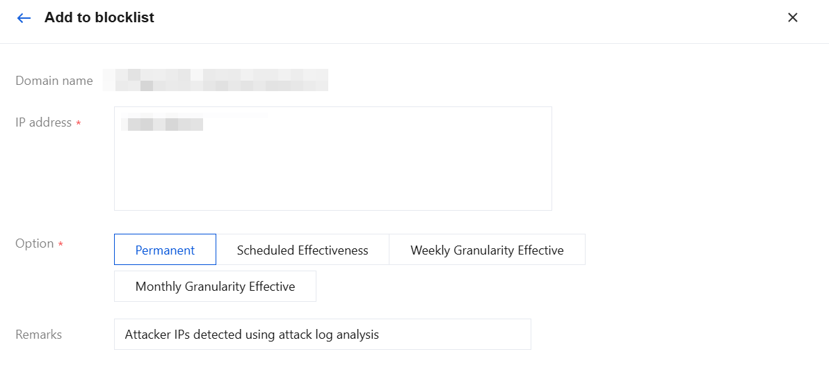 Block source IP: Supports one-click addition of IP blocklists to block access from the corresponding IP address. After completing the modifications, click OK.