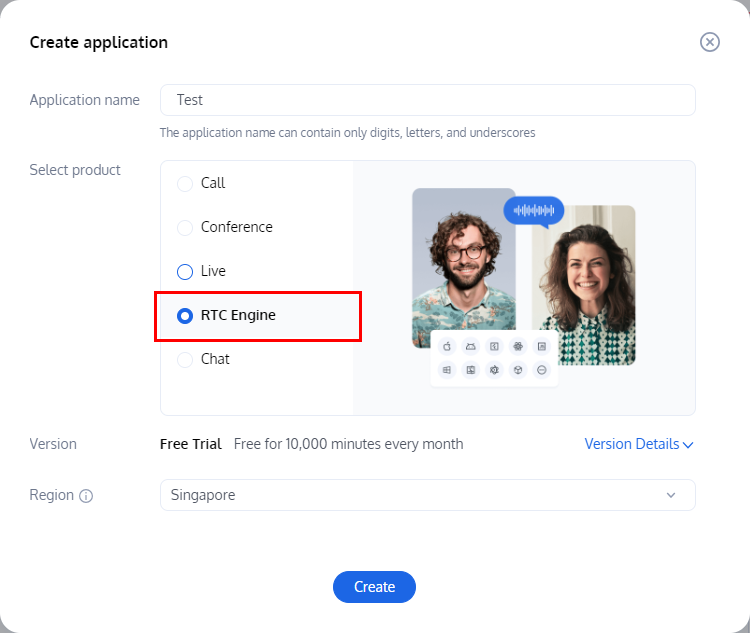 2. In the popup page, select RTC Engine, enter the application name, and then click Create.
