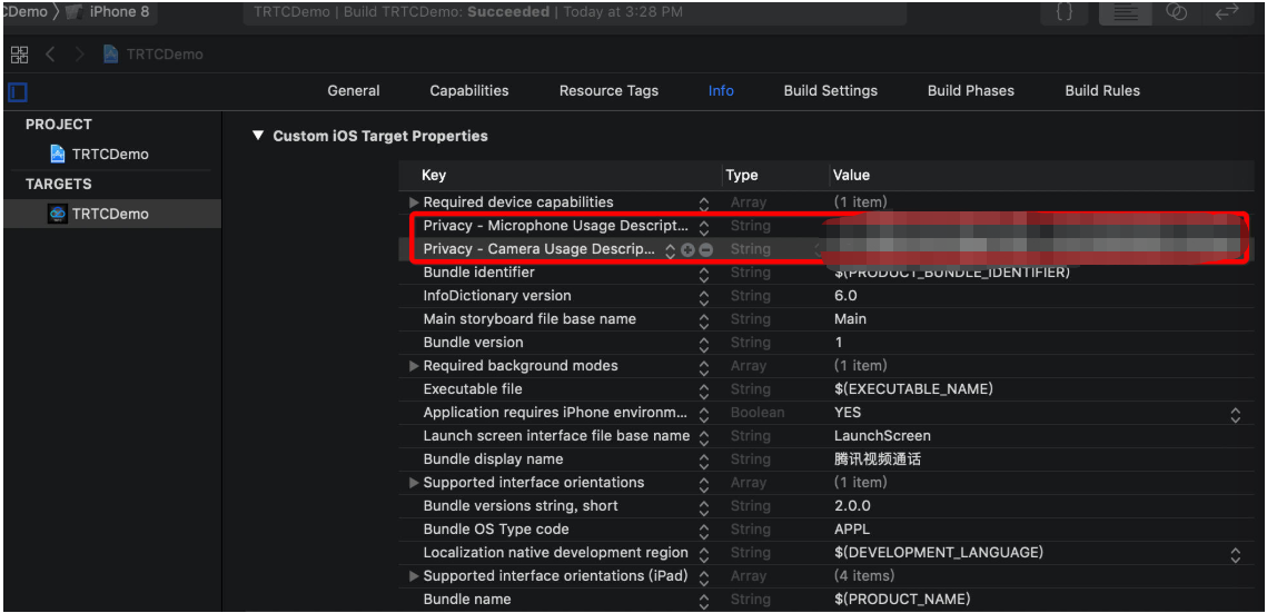 Source and Resources folders and the TUIRoom.podspec file must be in the same directory.TXAppBasic.podspec is in the TXAppBasic folder.TUIBeauty.podspec is in the TCBeautyKit folder.Info.plist of your app. Their content is what users see in the mic and camera access pop-up windows.<key>NSCameraUsageDescription</key><string>RoomApp needs to access your camera to capture video.</string><key>NSMicrophoneUsageDescription</key><string>RoomApp needs to access your mic to capture audio.</string>
