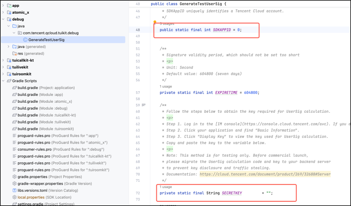 1. Configure SDKAppID and SecretKey: Open theapplication/debug/src/main/java/com/tencent/qcloud/tuikit/debug/GenerateTestUserSig.javafile, and fill in the SDKAppID and SDKSecretKey obtained during Activate the Service: 2. Compile and Run: Please select a device and run the Demo.