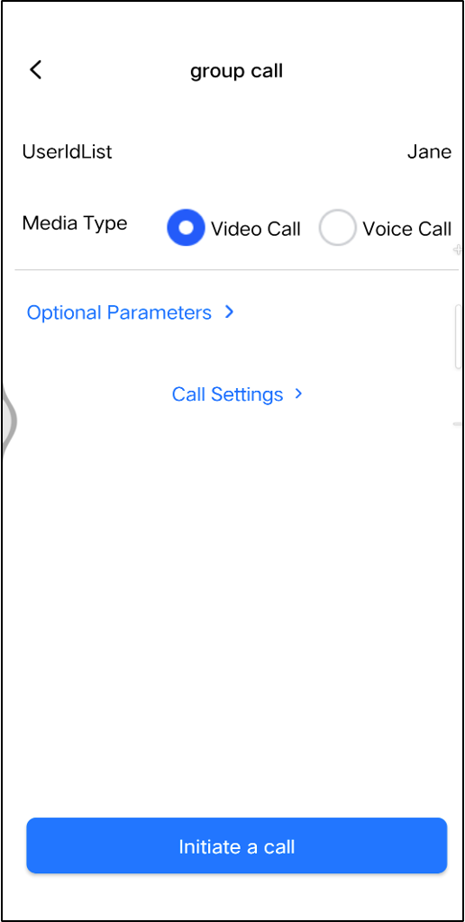1. Click Call on the interface. On the next screen, enter the recipient's ID in the User ID List and select the Media Type.