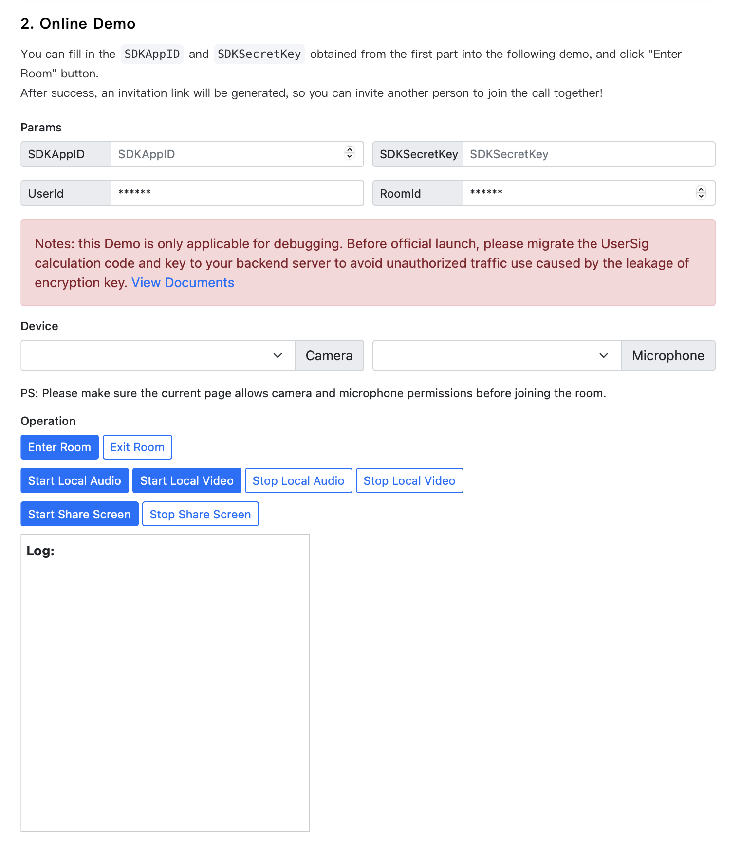 2. You can enter the SDKAppID and SDKSecretKey obtained in step one into the corresponding input boxes on the Running Demo Page, then click the enter room button. Purchasing the Official Editions