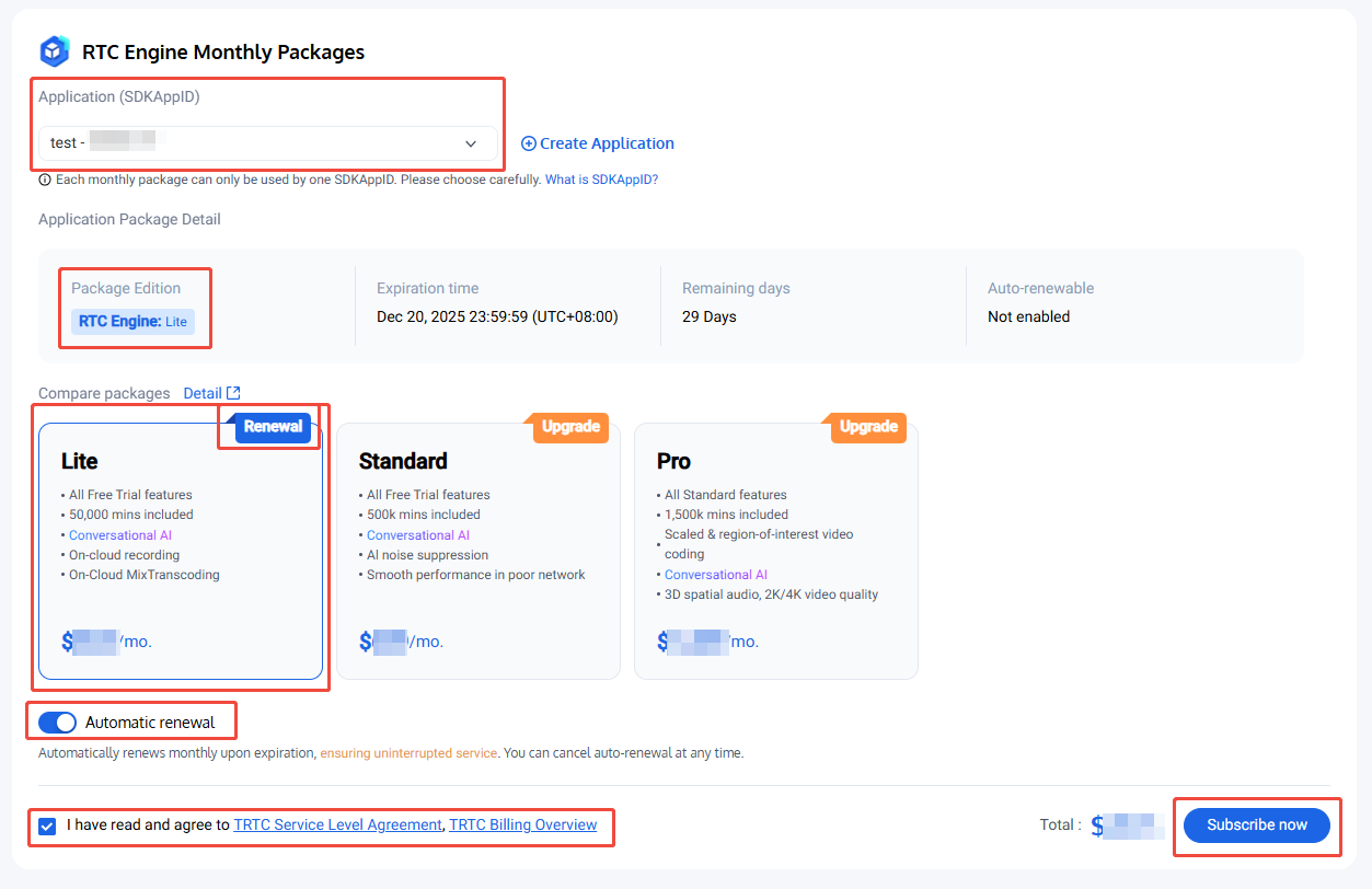 You need to purchase the RTC-Engine monthly subscription to use the RTC-Engine SDK. For price and feature comparison details of the RTC-Engine monthly subscription, see RTC-Engine Monthly Subscription. To purchase, follow the steps below: 1. Visit RTC-Engine Purchase Page, select the application (SDKAppID) and version to purchase, and it is recommended to enable auto-renewal to avoid impacting business usage. After confirming purchase information and agreeing to the relevant agreement, click Subscribe now. Renew the Official Edition