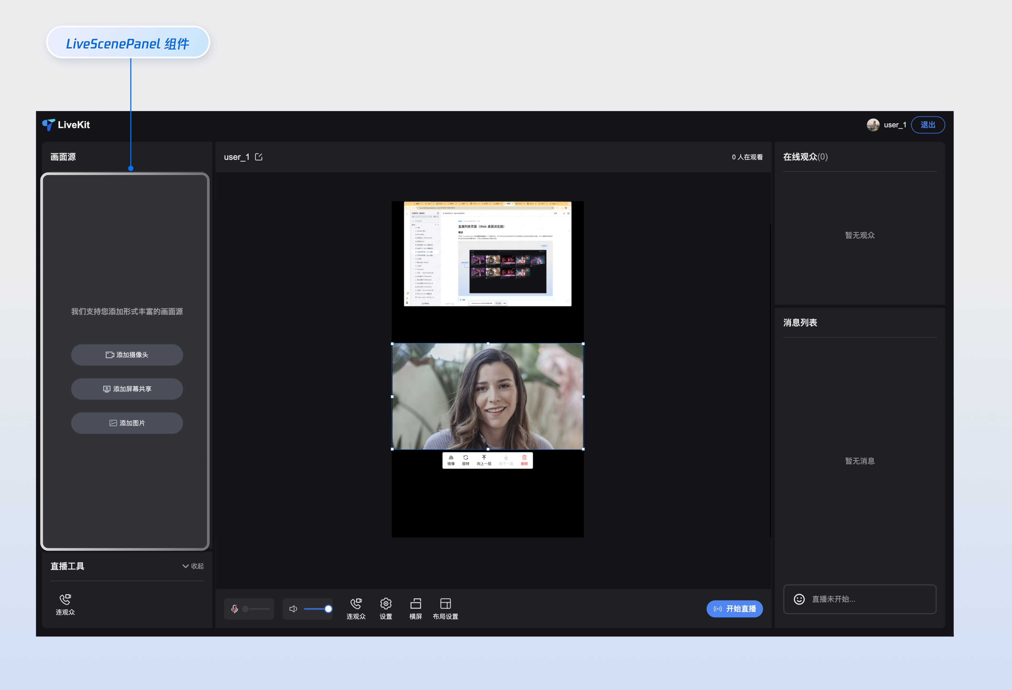 <template><!-- 状态显示 --><div class="status-info"><span>素材数量: {{ materialCount }}</span><span>最后操作: {{ lastOperation }}</span></div><!-- LiveScenePanel 组件 --><LiveScenePanel /><StreamMixer /></template><script setup lang="ts">import { ref, computed, watch } from 'vue';import { LiveScenePanel, useVideoMixerState, StreamMixer } from 'tuikit-atomicx-vue3';// 使用状态管理 hooksconst { mediaSourceList } = useVideoMixerState();const lastOperation = ref('无');const materialCount = computed(() => mediaSourceList.value.length);// 监听素材列表变化watch(mediaSourceList, (newList, oldList) => {if (newList.length > oldList.length) {lastOperation.value = '添加素材';console.log('素材已添加');} else if (newList.length < oldList.length) {lastOperation.value = '删除素材';console.log('素材已删除');}}, { deep: true });</script><style>.status-info {display: flex; gap: 20px; padding: 12px; background: #f8f9fa;border-radius: 6px; margin-bottom: 16px;font-size: 14px;}</style>