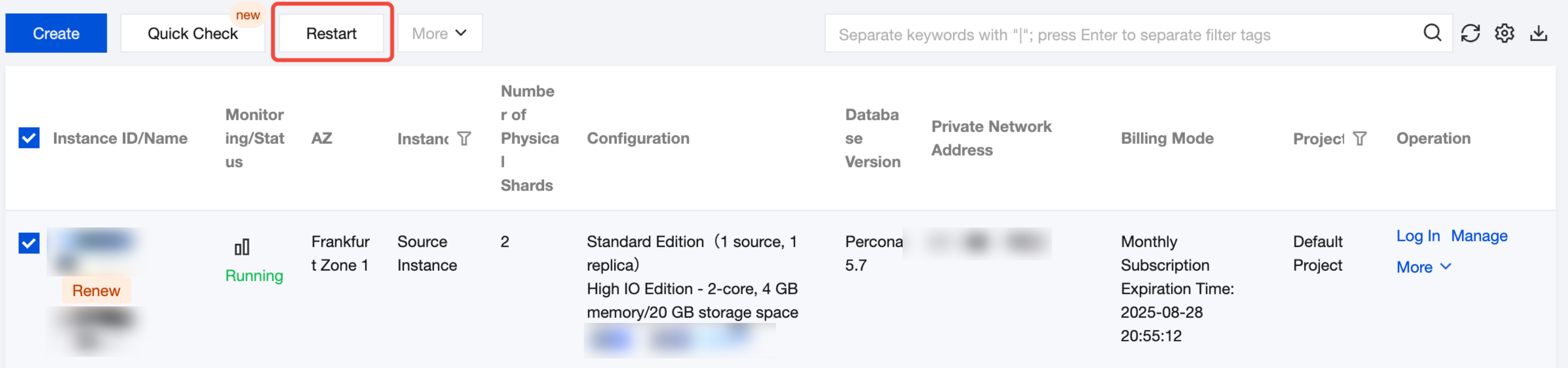 Preparation for restart: during the restart, the instance cannot provide services. Therefore, before the restart, please ensure that TDSQL for MySQL has stopped accepting business requests. During the restart, dirty pages will be generated if the business write volume is high. In this case, the restart may fail in order to shorten the business interruption.