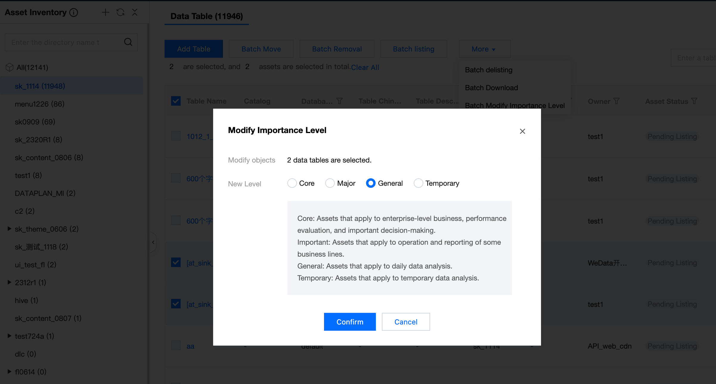 Enter the asset catalog inventory webpage, check the assets that need to modify importance level, click batch modify importance level.