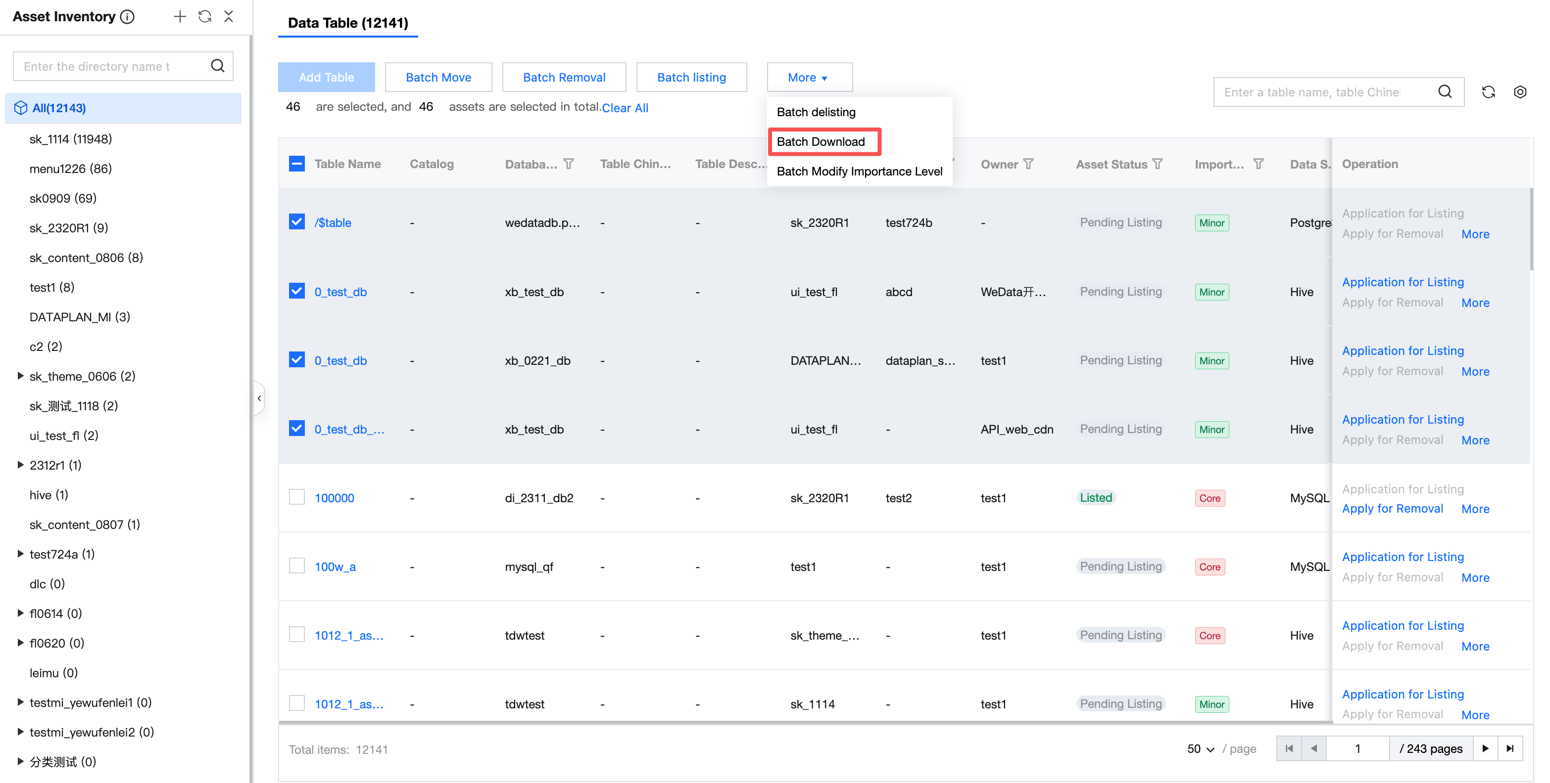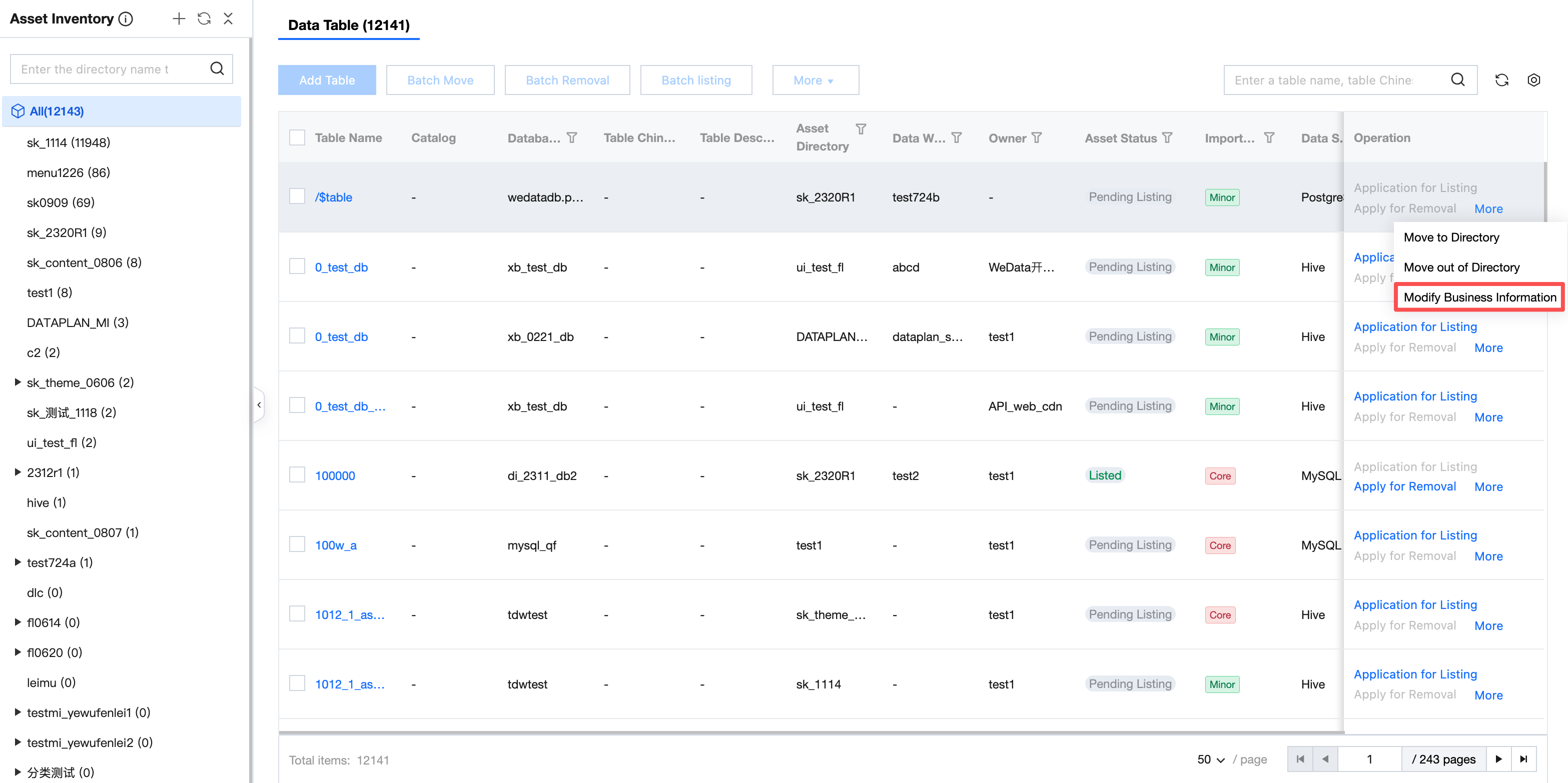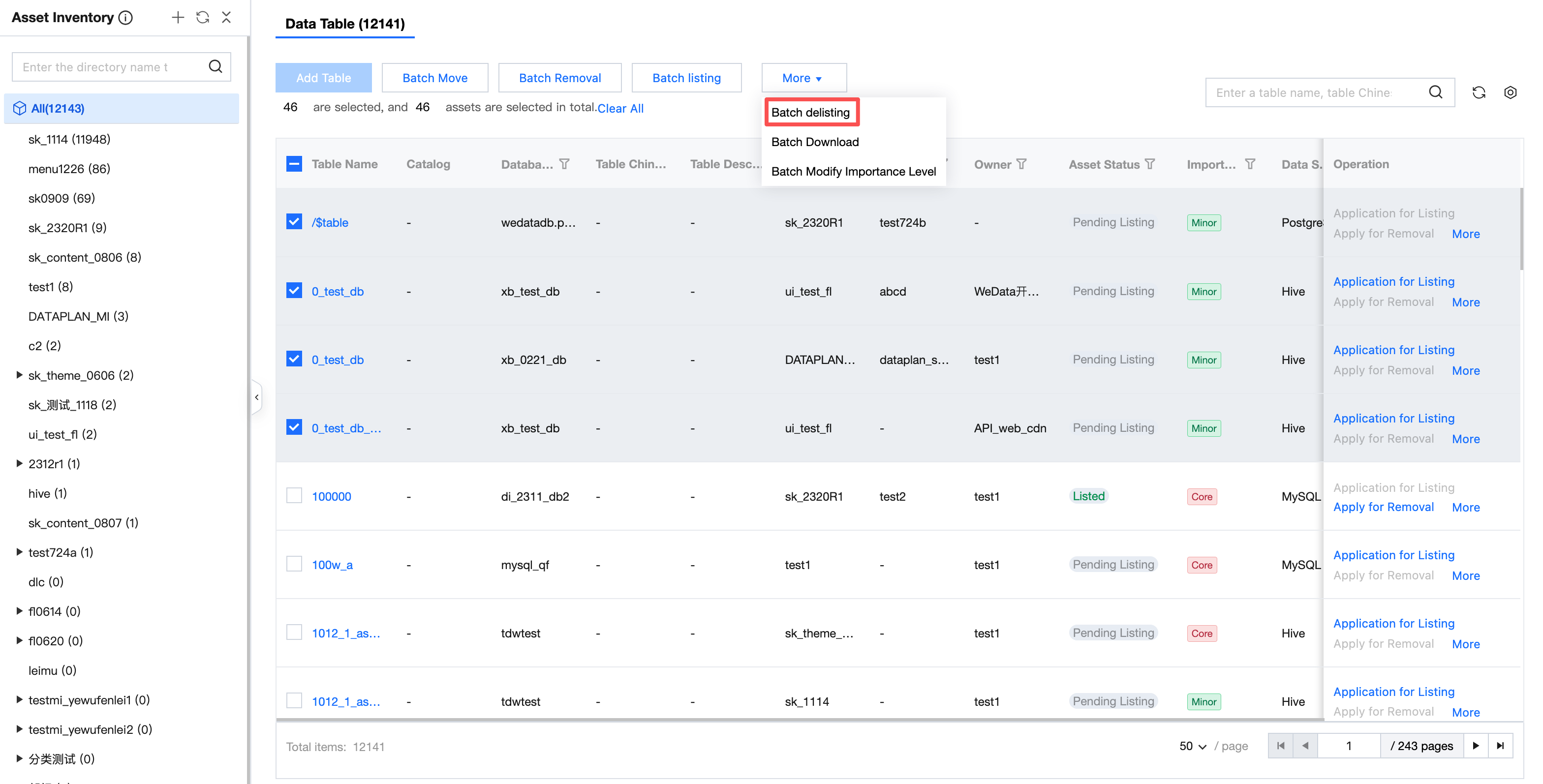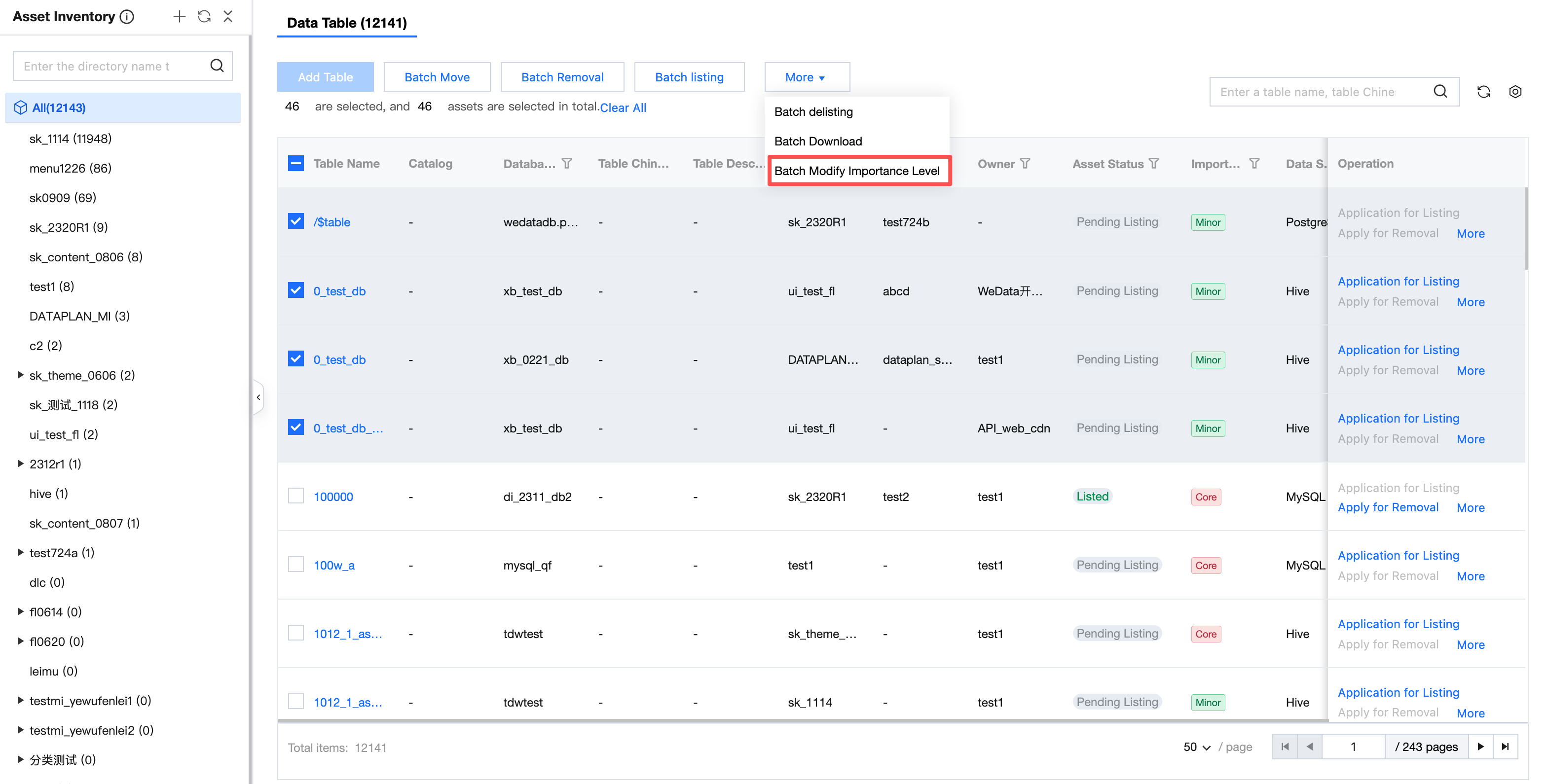 Inventory for tables: add table, move table (batch move), listing/removing table (batch listing/removing), download table, modify table importance level, modify table business information.