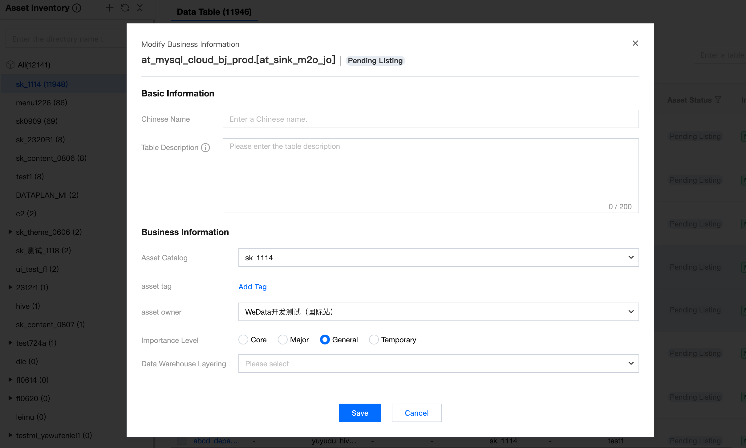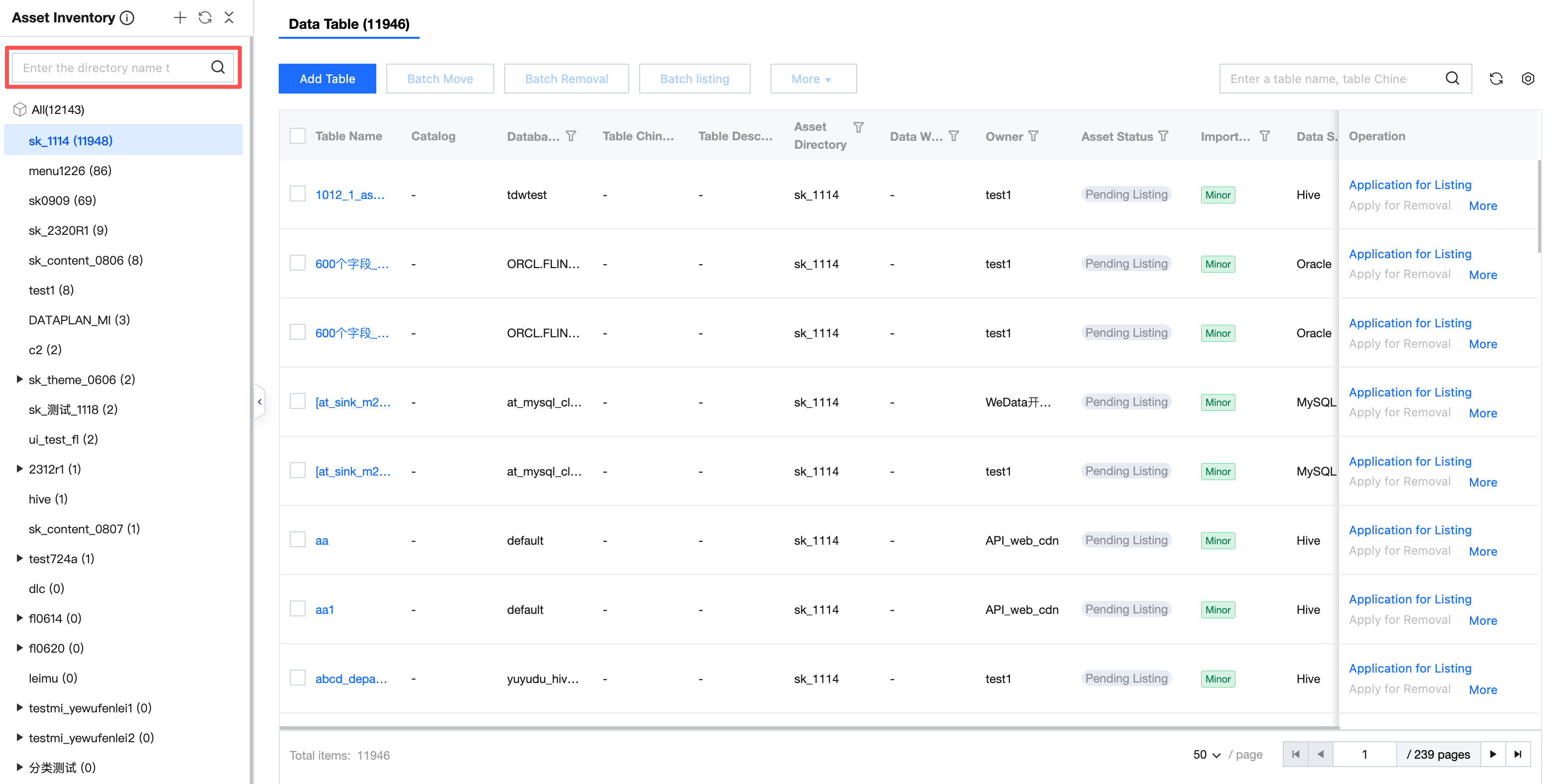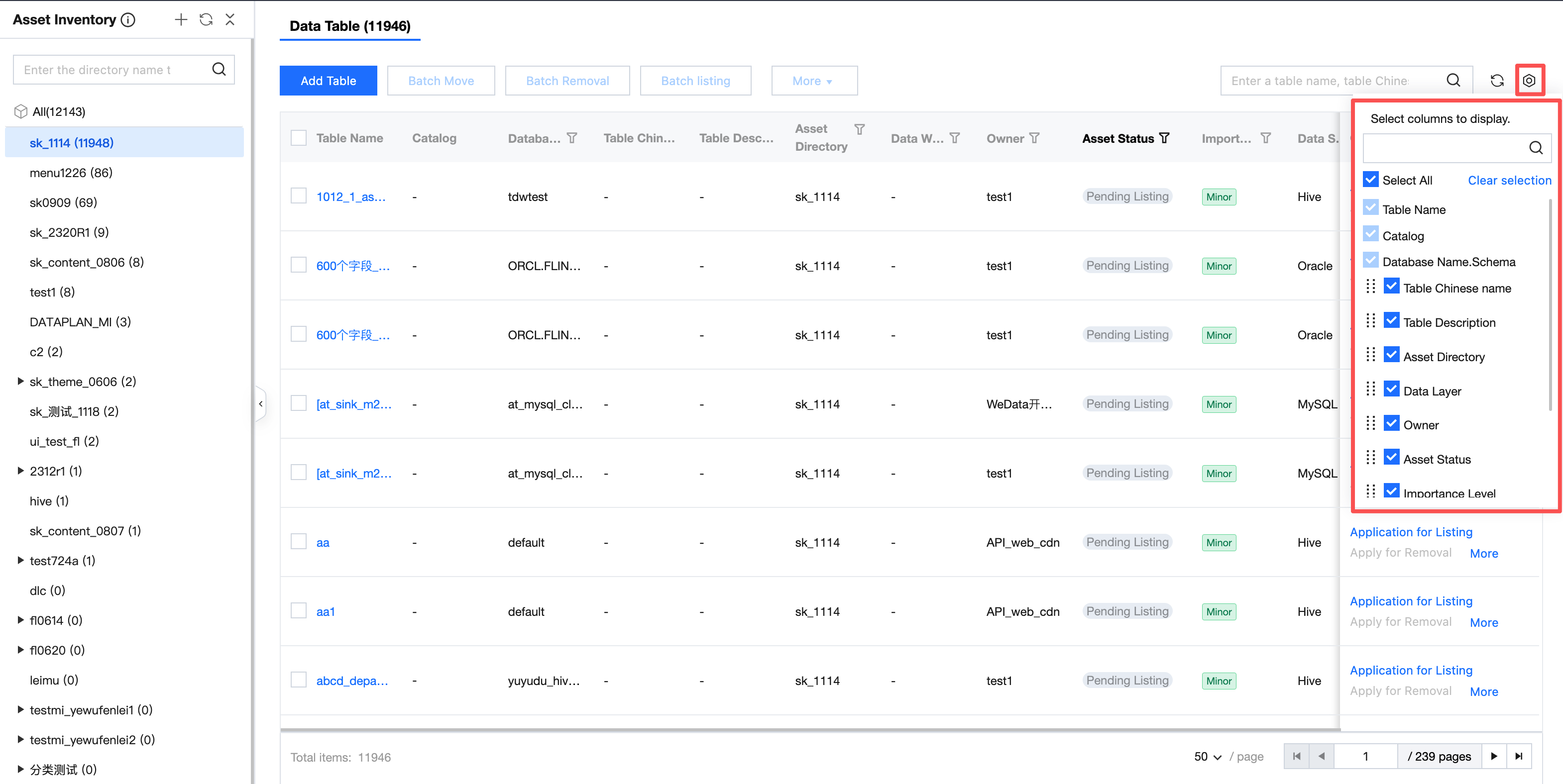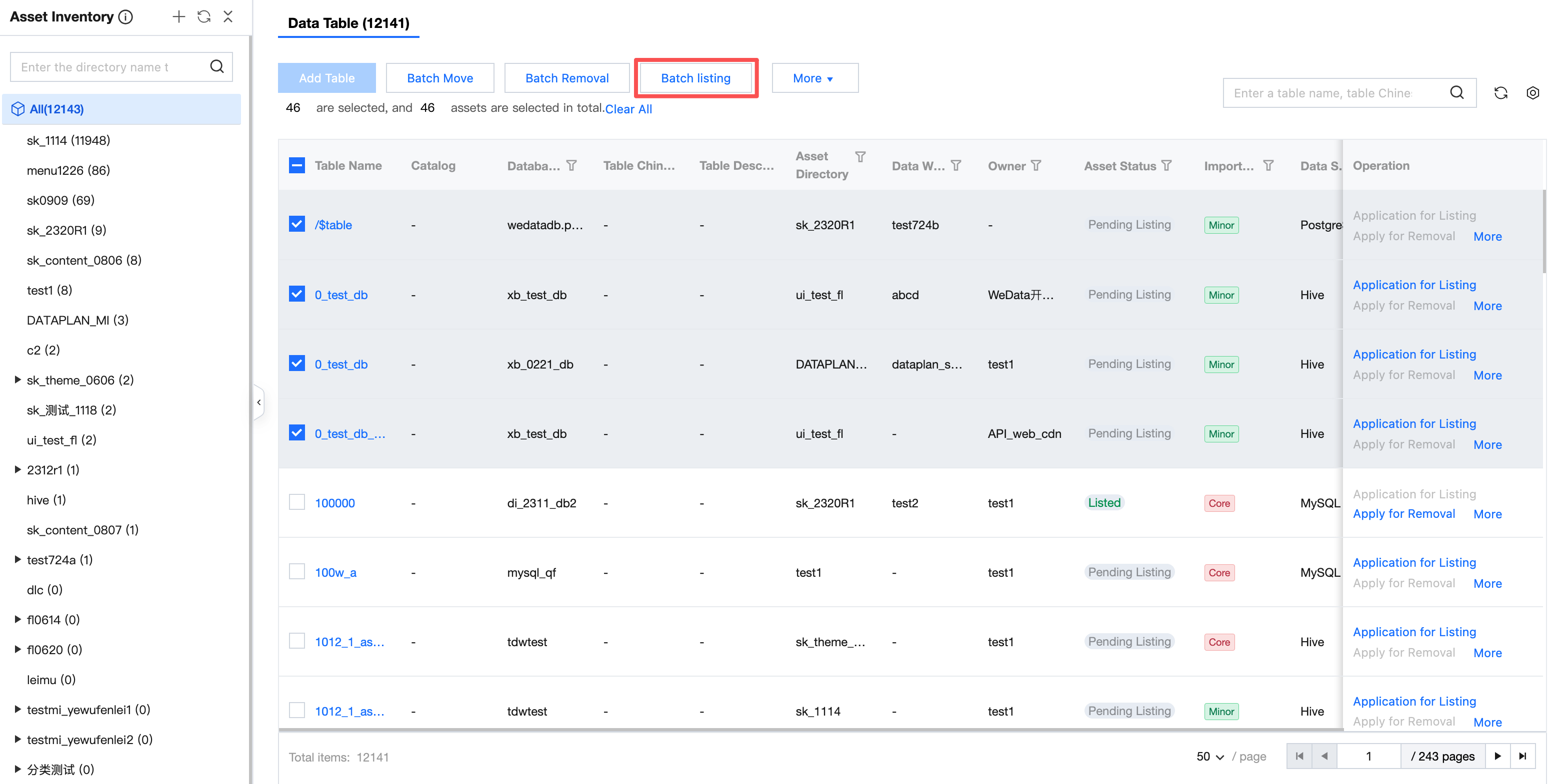 Inventory for tables: add table, move table (batch move), listing/removing table (batch listing/removing), download table, modify table importance level, modify table business information.