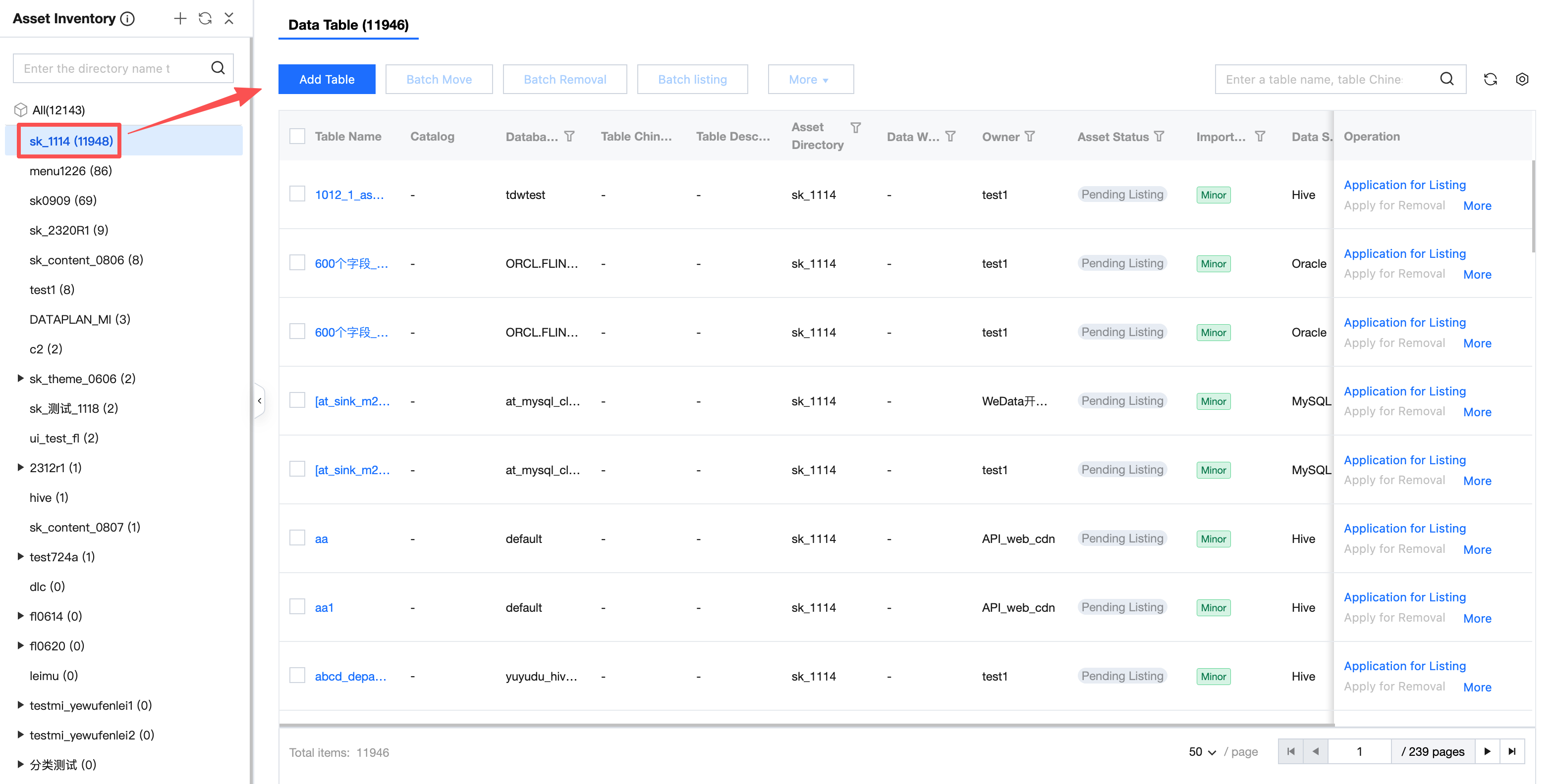 Enter the asset catalog inventory page, select the target directory, and then click add table.