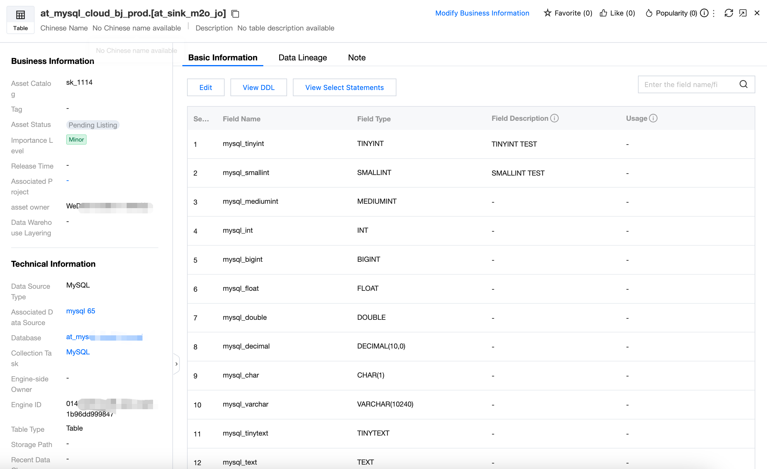 Enter the asset catalog inventory page, click the table name in the list to view the table detail.