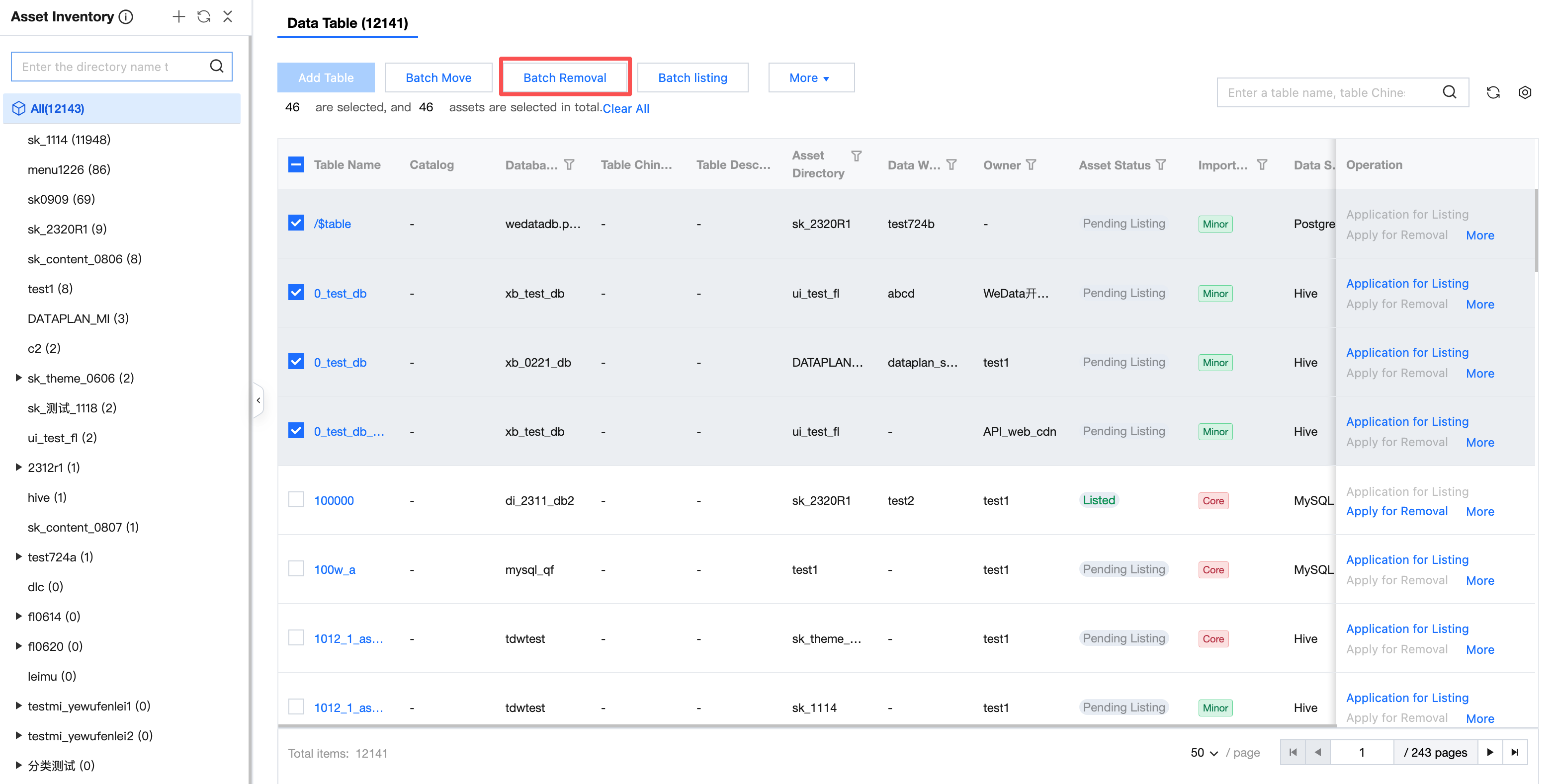 Enter the asset catalog inventory webpage, check the needed assets, click batch removal at the top, and you can batch remove the assets from the current directory node.
