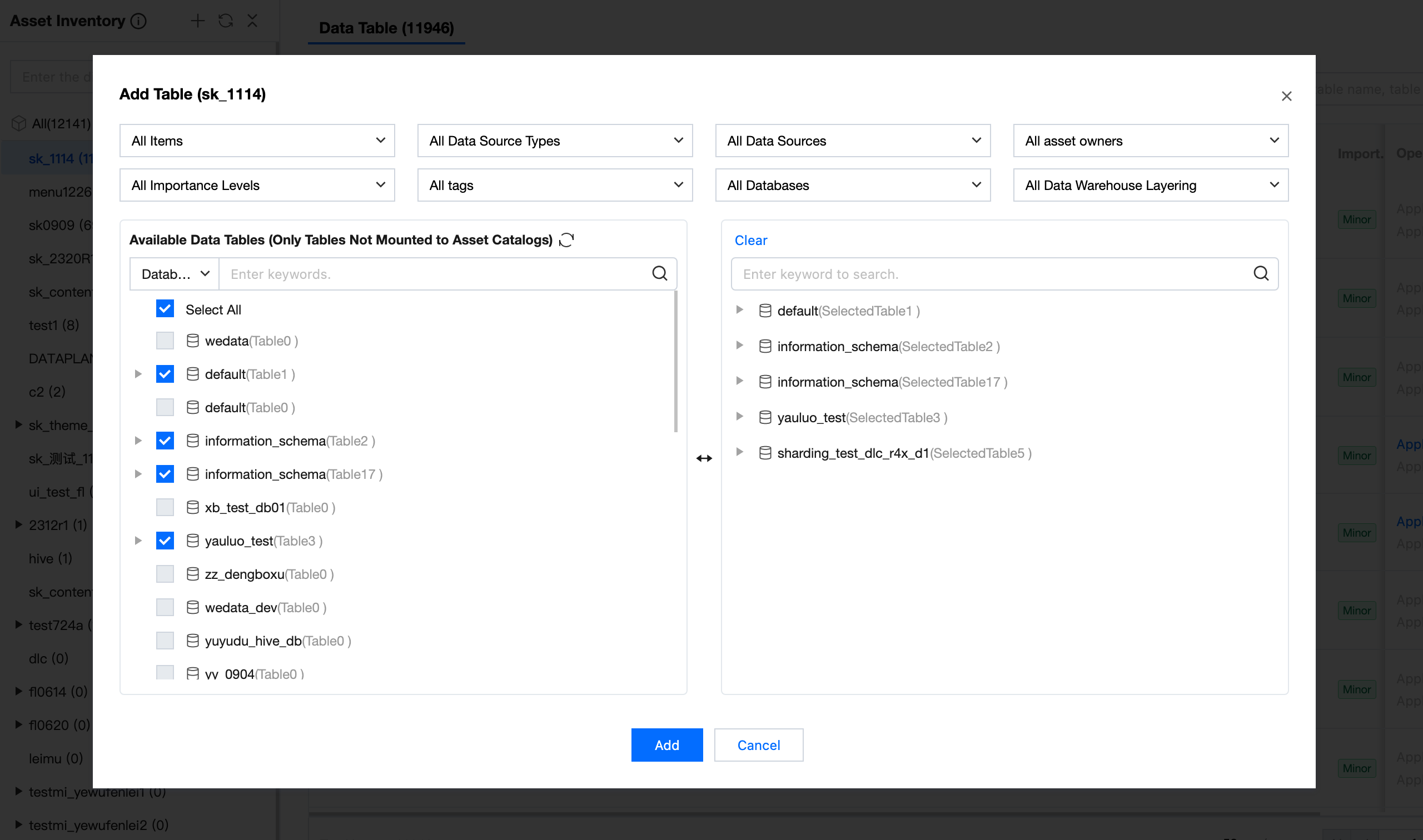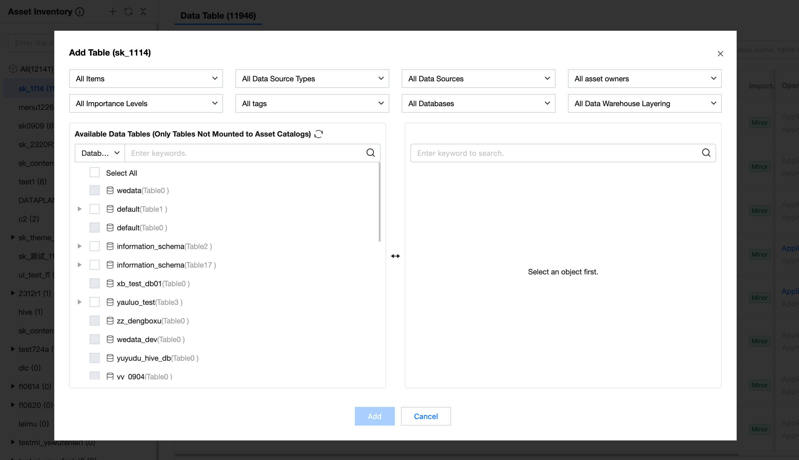 Click the add button and select the data table in the pop-up. Support quick filtering of tables through project, data source type, data source, table owner, importance level, tag, database, data warehouse layering, and keyword. You can also directly select database tables via the tree structure on the right.