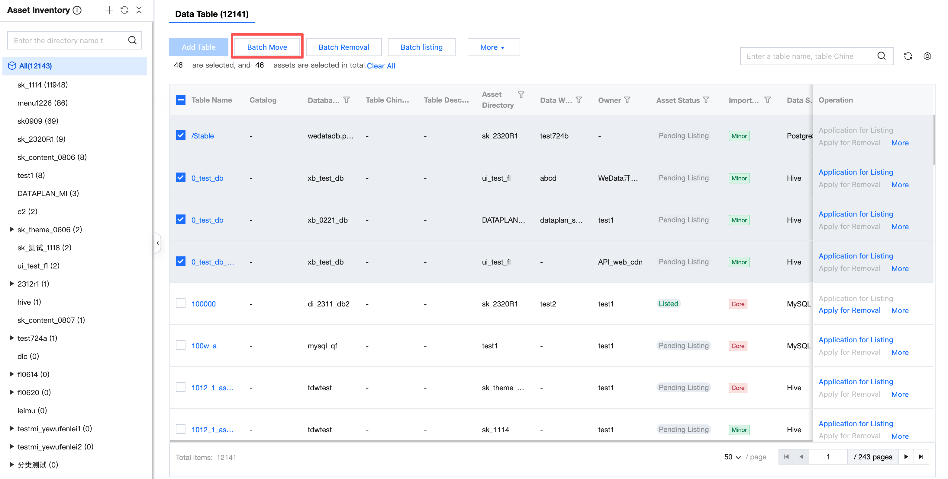 Enter the asset catalog inventory webpage, check the needed assets, click batch move at the top, and you can move the assets to another directory node in bulk.