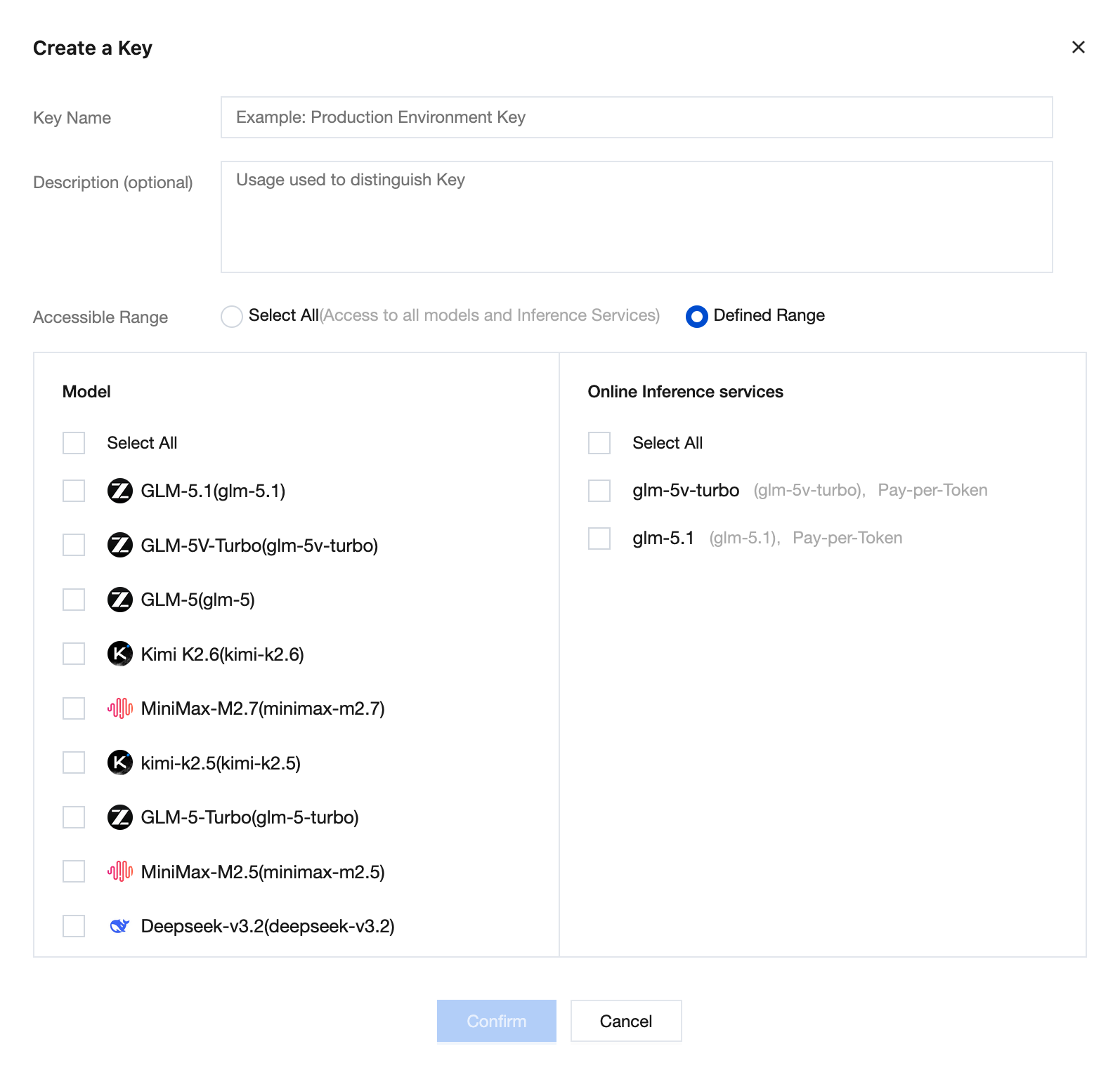 Defined Range: You can select accessible models and inference services on the left and right sides of the Access Scope area to implement access scope control.