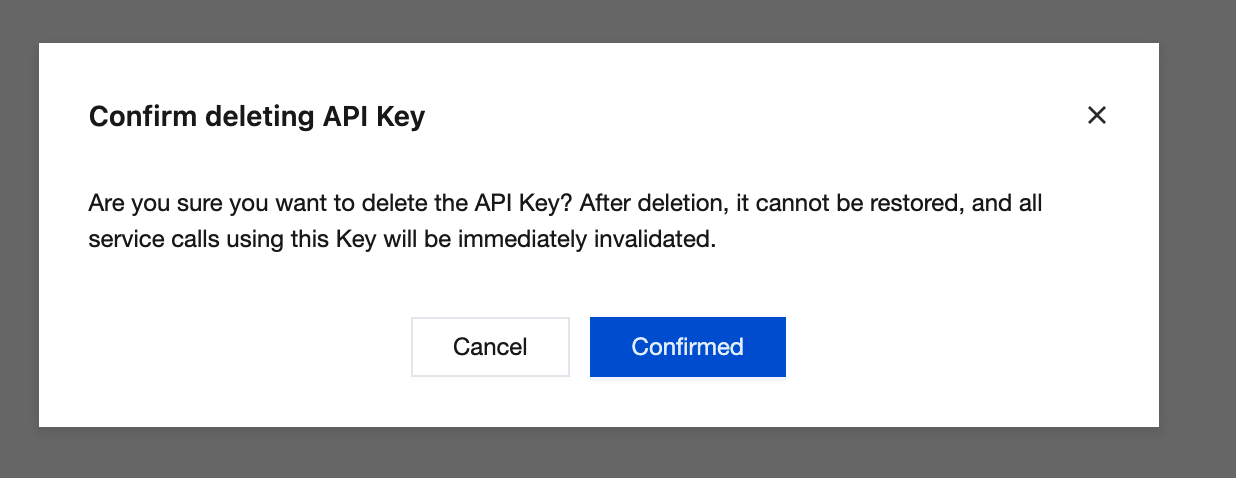 4. In the Confirm deleting API Key dialog box, after verifying the deletion information is correct, click Confirmed to complete the deletion.