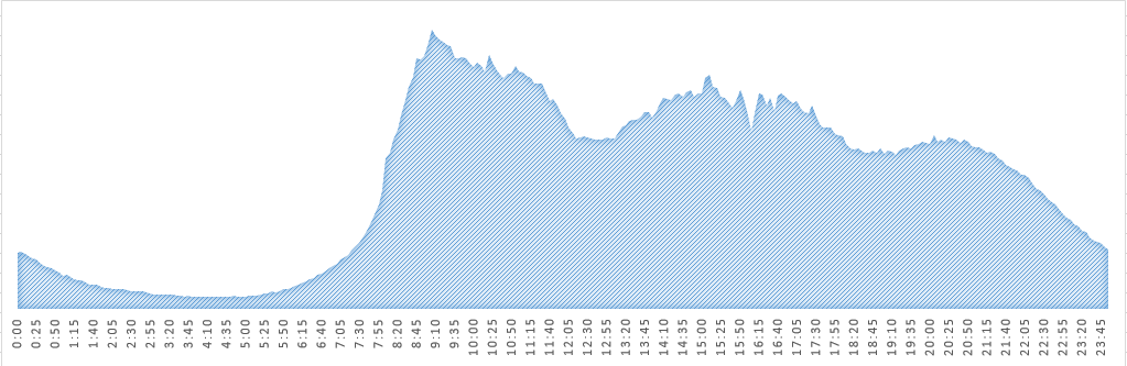 Misalkan konsumsi lalu lintas antara 00.00 hingga 23.59 kemarin adalah 200 GB, dan tidak ada konsumsi di wilayah di luar Tiongkok daratan.Bandwidth puncaknya adalah 40 Mbps seperti kurva berikut: