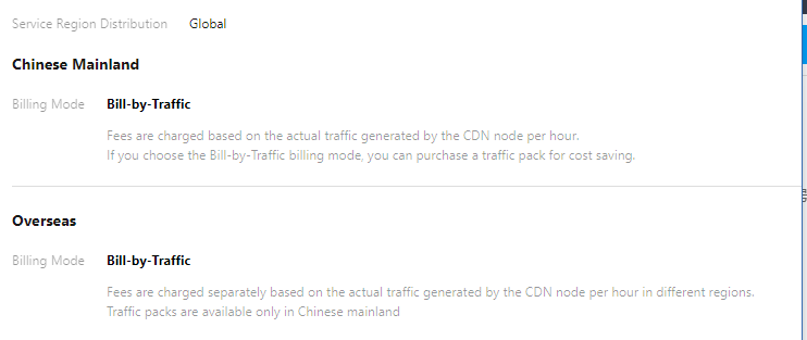 Tencent Cloud CDN memiliki dua wilayah penagihan, yaitu Chinese mainland (Tiongkok daratan) dan outside the Chinese mainland (di luar Tiongkok daratan). Untuk pengguna yang mengaktifkan CDN setelah 7 Desember 2020 21.30, bill-by-hourly-traffic (tagihan-berdasarkan-lalu–lintas-per-jam) adalah satu-satunya opsi penagihan. Untuk informasi selengkapnya, silakan baca Ikhtisar Penagihan.